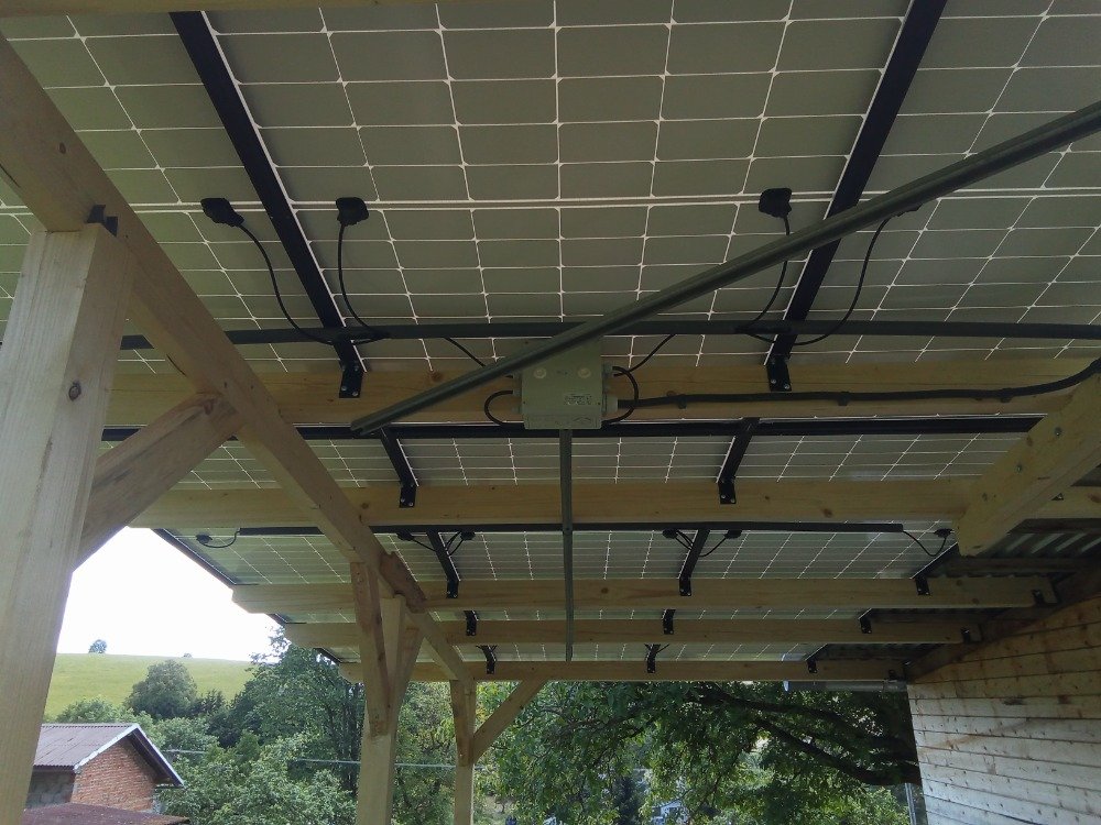 Oživuji fotovoltaický přístřešek 9 x 385 Wp. Panely jsou na sebe nalepeny klempířským tmelem. Bohužel to někde prosakuje, nemyslím, že bych to měl někde špatně vytmelený ale ty rámy se zdá, že nejsou vodotěsný. Podobný prosakovací patálie zmiňoval na youtube TO220.