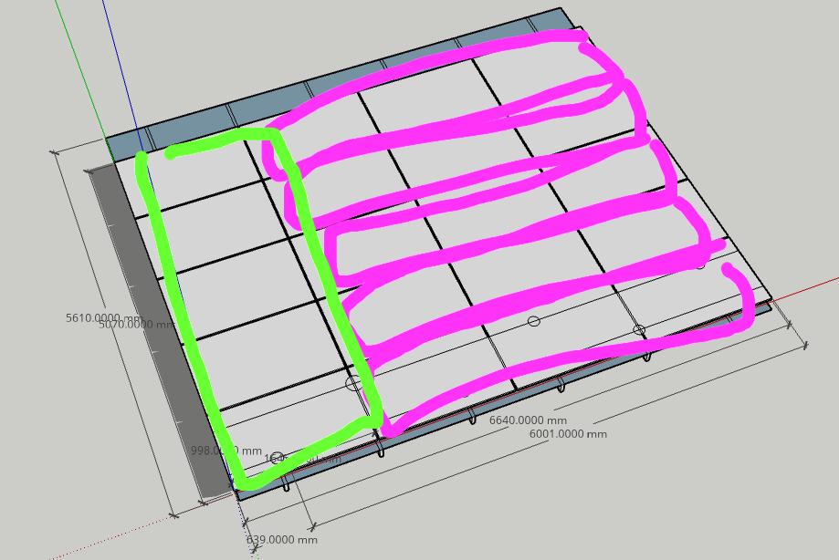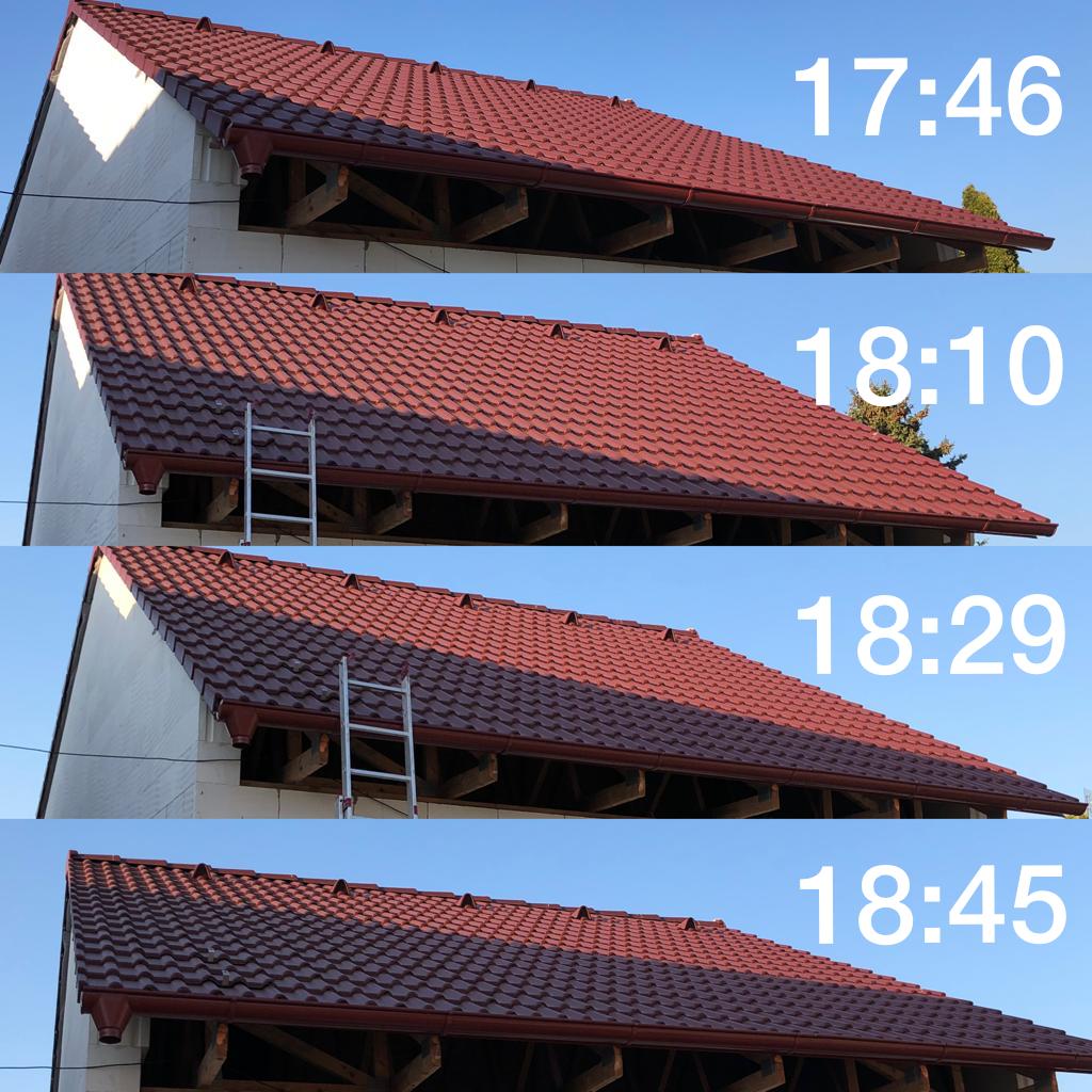 A taky jsem zachytil jak putuje stín po střeše.Bohužel s tím nic neudělám, takže stringy budu muset dělat vodorovně a ještě v pravé části. Protože mi to vychází na 4 panely na řadu a celkem 5 řad na výšku, tak v každé řadě bude jeden string o třech panelech. Zbylý sloupec o čtyřech bude asi na pokusy, nevychází to ani výkonově na kinga, tak možná rovnou vytěžování do přitápění v garáži?