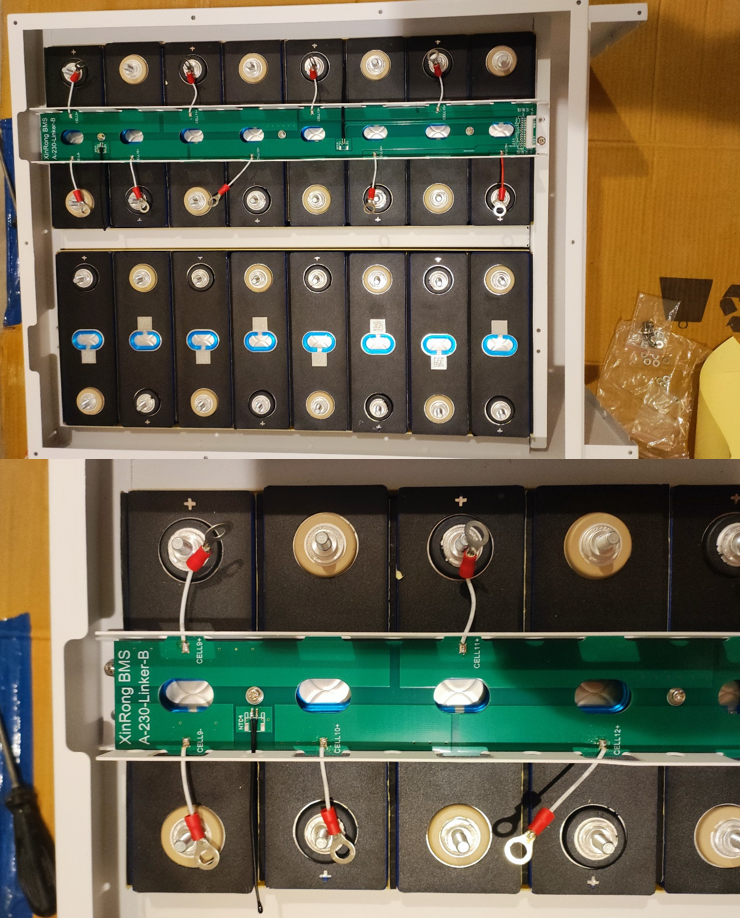 Rozložil som izolačný sklolaminát a povkladal články. Medzi jednotlivé články je vložená čierna pružná penová doska hr. cca 3mm. Články sú potom stlačené vekom (9xM4 skrutky). Nasleduje montáž zberníc pre balančné prípojky (zospodu je opäť nalepená čierna pružná pena). Po vložení všetkých článkov, nastala daľšia komplikácia - rozteč medzi stľpcami článkov je vačšia a treba dlhšiu prepojku článkov. Spravil som z 2x16mm2 kábla. Potom nasledovala "gynekologická" operácia namontovať horný panel a súčasne prestrčiť silové a balančné káble do priestoru pre batérie. Všetko prepojené, termistory prilepené páskou na články. Prepojka stľpcov článkou je prepojkou z 2x16mm2 – rozteč cca 74mm. Nasledovalo zapnutie BMS - nabehla na prvý šup - nastaviť na Life, .... Funguje BT aplikácia ako pre ostatné JKBMS, len tých nastavení je tam viac.