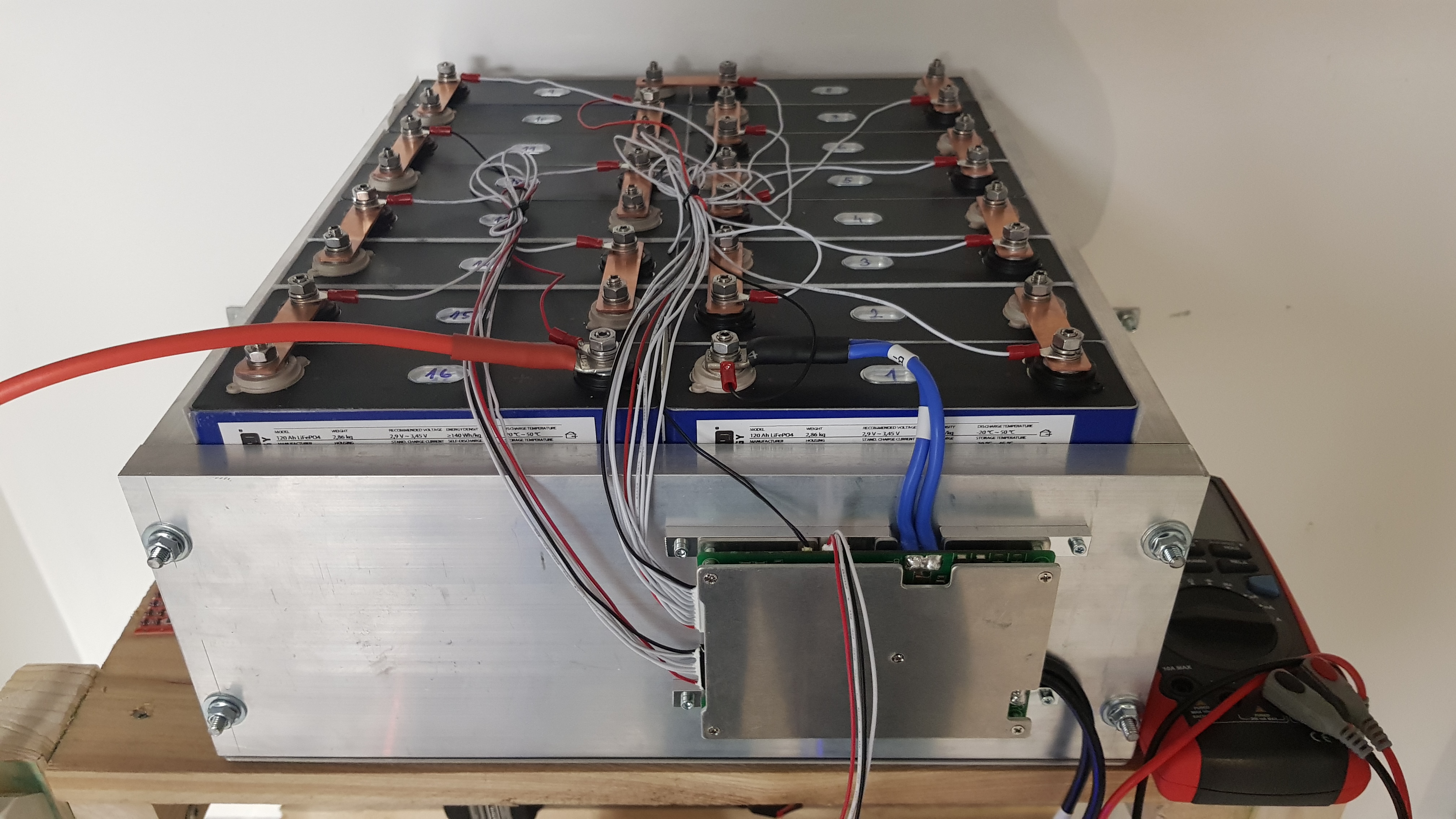 Kromě BMS, který má každý string vlastní, omezují nabíjecí proud v konečné fázi nabíjení ještě dva vytěžovače s různými prahovými úrovněmi (cca 53,6 V).