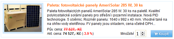 Taky bych se na to vy...l, ať si koupí každý sám, však není problém koupit u nás se zárukou paletu 30ks panelů VSUN, nebo Amerisolar 285 Wp kus za cca 2400 i s daní. Ale to je asi pro někoho ještě hodně drahé