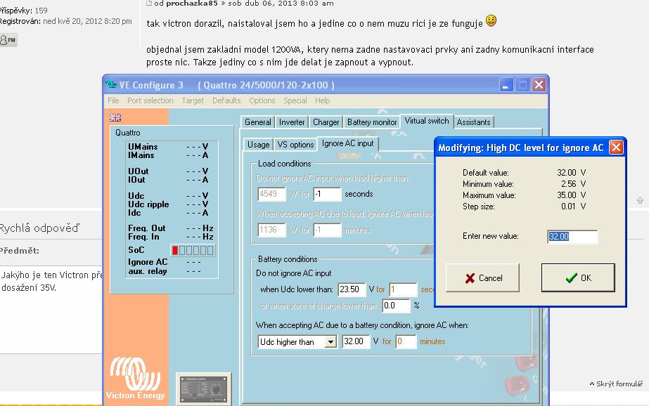 Jakýho je ten Victron přesně typu? V nastavení co mám já, může být připojovací napětí virtuálního sepnutí - připojení po dosažení 35V. Jde o Victron C multiplus 2000VA 24V