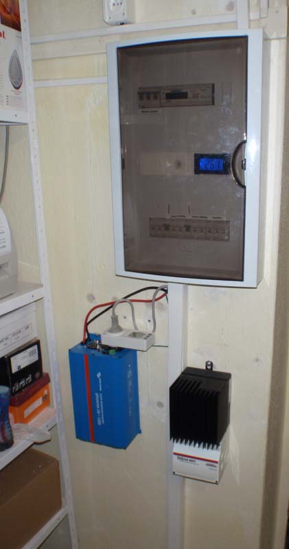 7,1kWp - 8x3 panely Renesola 240Wp, 2x3x235Wp lightway, 2xTristat TS60, trakční 48V 2x750Ah olovo, 2xměnič Studer XTM 4000, SDS Micro, solární dvouosý tracker se třemi panely