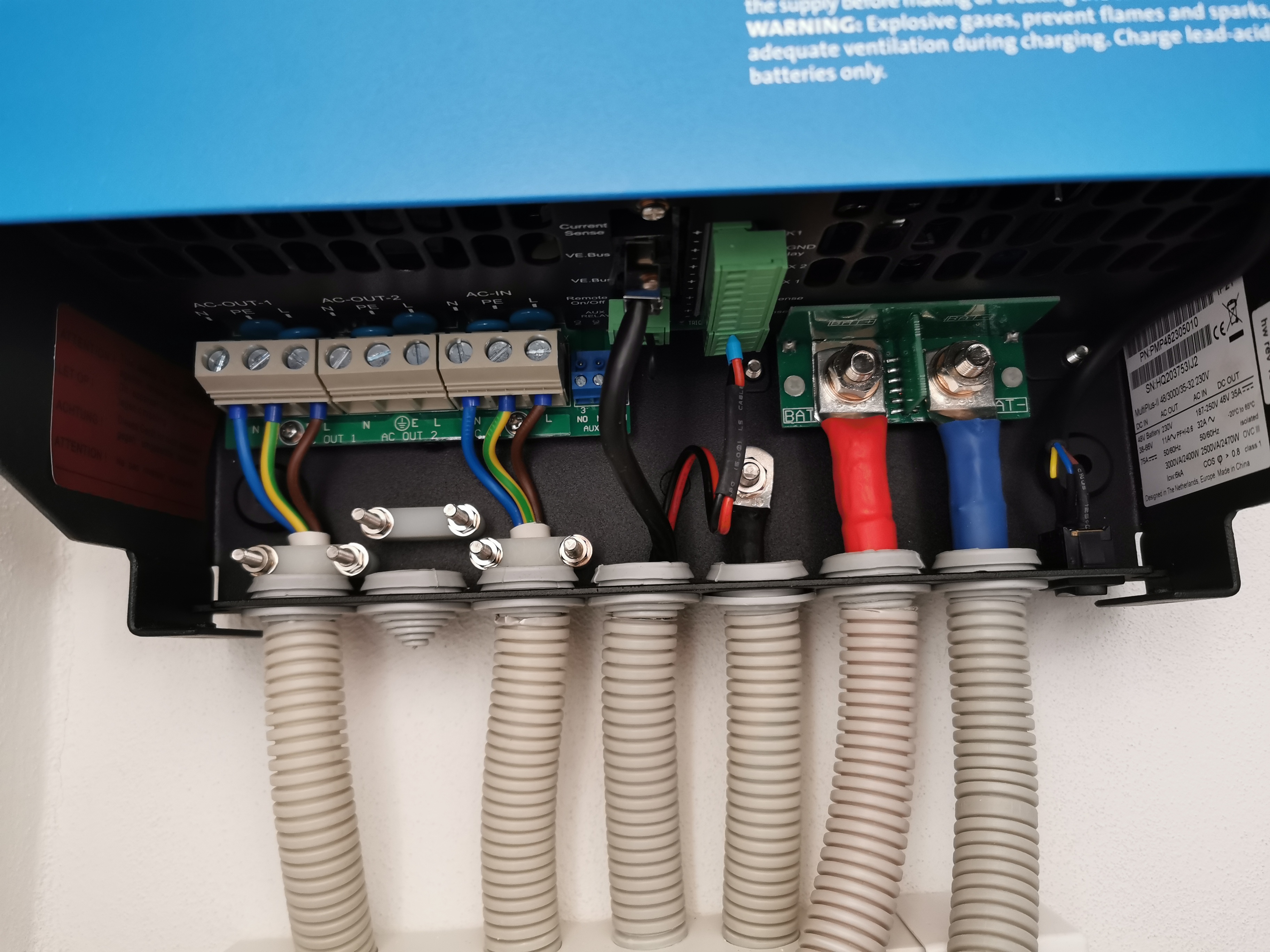 Po kompletní rozborce elektrárny k prodeji jsem se po týdnu pustil do montáže. Jelikož stavím s Victronem, tak to tu alespoň nebude taková nuda a bude tu vidět také něco nově postaveného na Victronu. Zatím jsem pokročil ze stavu beznaděje do stavu nevím co dřív. Ale začíná se to rýsovat a já pokračuji cestou malých úspěchů do zase lepšího cíle. První foto zde Victron a ano není dle manuálu 10x10x10cm od všeho, ale jak již je známo, místa máme poskromnu a zázraky od něj nechci je to upgrade z multiplus 800. Měl jsem velké ambice mít z sběrnice do mulťáku 120mm2 co je max na sběrnici, ale po tom co jsem se dělal s 50tkou si myslím, že víc jak 75tka se tam bez redukčního oka nemůže vejit. Už takhle je to na můj vkus blízko té rozdělovací dps, která je nešikovně pájená na této straně a ne zezadu, ale věřím že je to nepropojeno a je to tedy odděleno tím sklolaminátem v dps. Zatím to není žádný zázrak, ale postupně řeším další kousky. Rozvaděč pro panely zatím nedorazil, ale místečko je již "připraveno", kabeláž natažená.