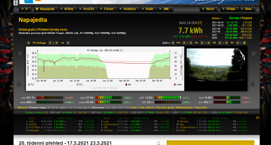 1,85kWp J 5∗Longi 370W mono 2∗Tracer 4210RN,1∗150/45 VICTRON vše 24V olovo 230Ah+400Ah Zimní provoz+0,9kwP amorfi V,J