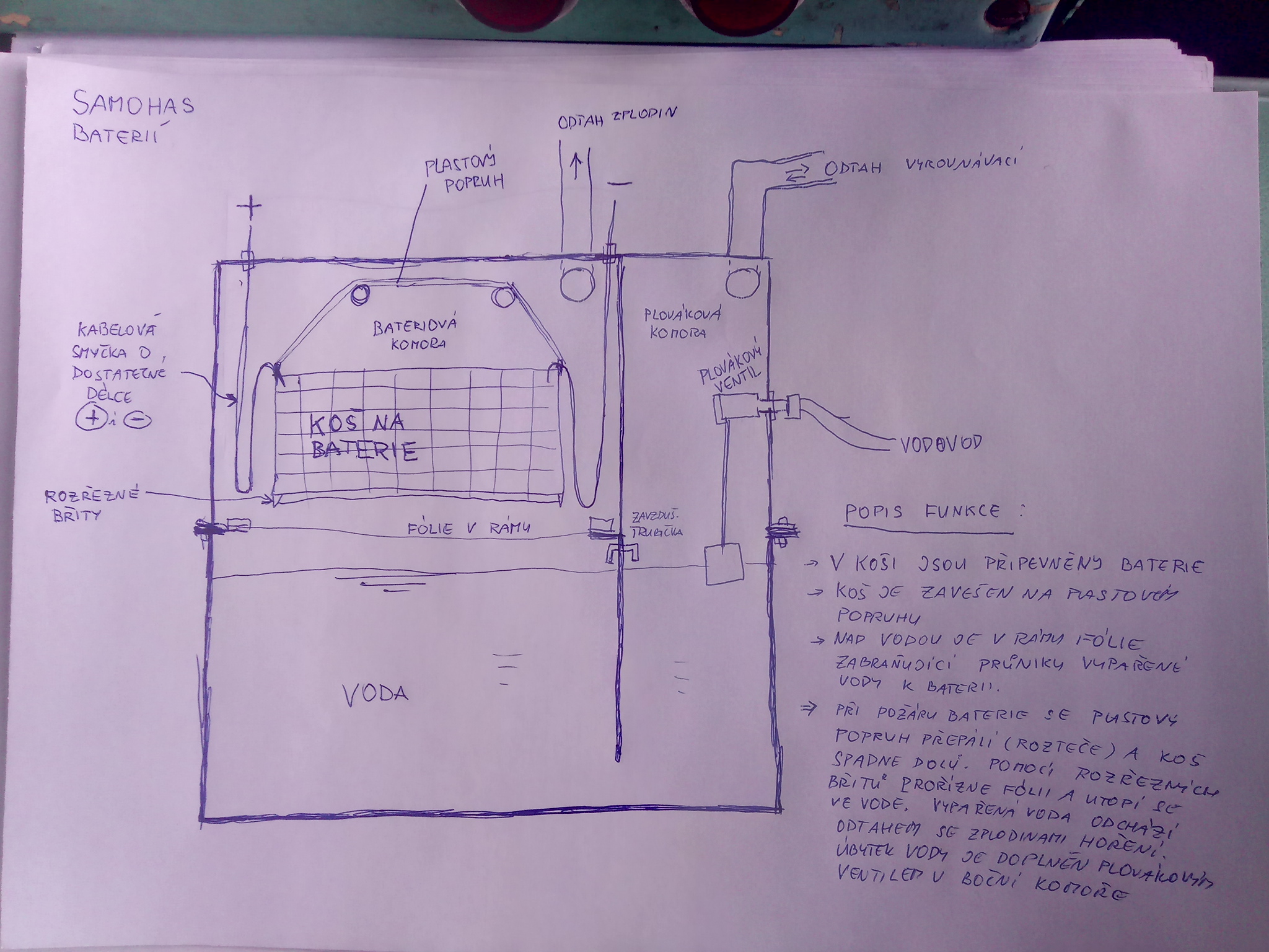 Jak si představuji funkci? Při požáru baterie se vzniklým teplem přepálí (přetaví) plastový popruh a koš s baterií prořízne folii a spadne do vody, kde se uhasí oheň. Zplodiny hoření a vodní pára odejdou odtahem pryč a vypařená voda je doplněna plovákovým ventilem.
