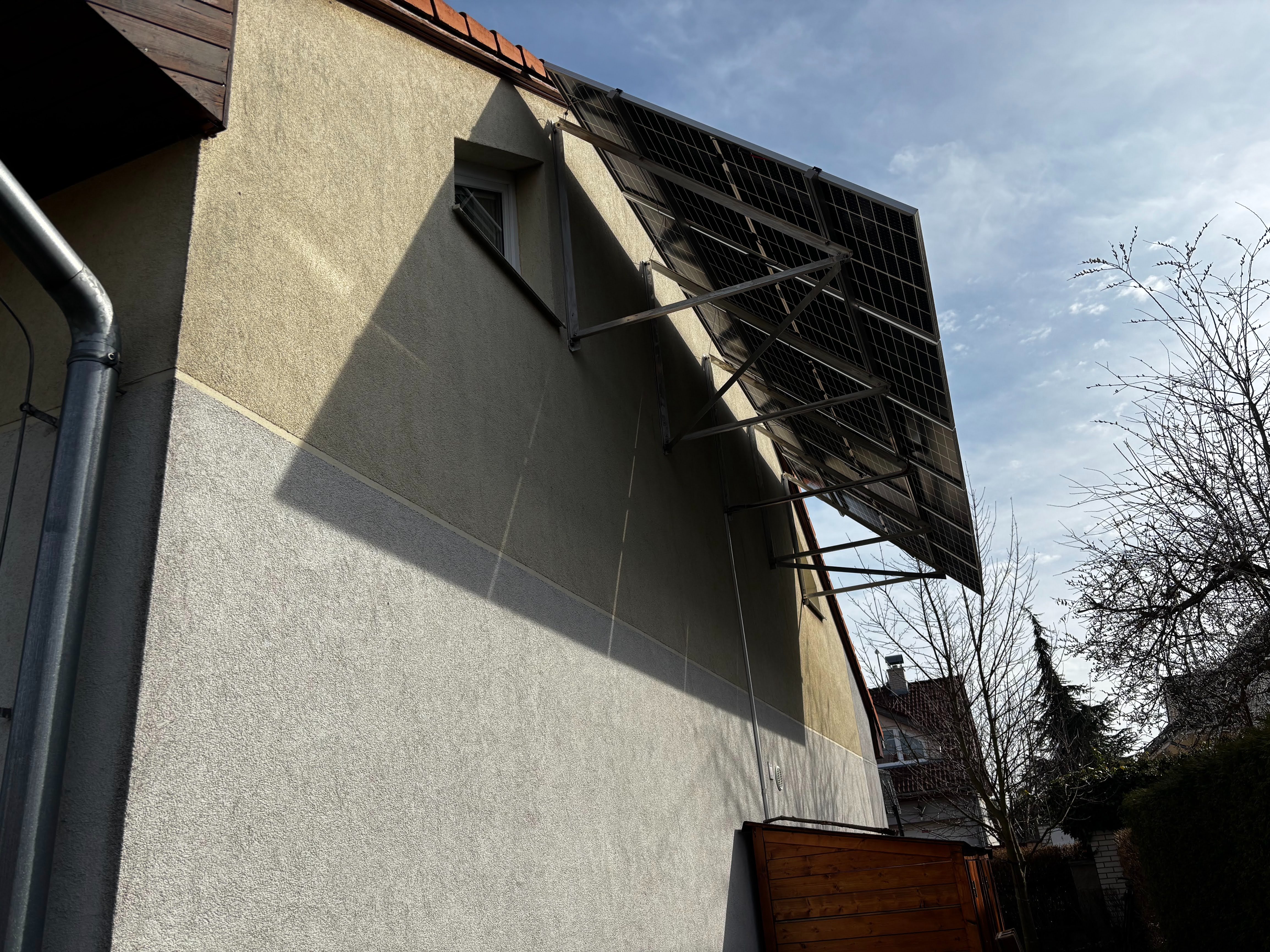 Rád bych upevnil na fasádu západním směrem 240st 2 panely Longi 520W (viz foto) přemýšlím, že je upevním tak, že na U jekl 35mm připevním na 16cm rantl nad garáží a panely do jeklu vložím. Druhou -horní část panelů, buď upevním opět pomocí dlouhého U jeklu, nebo pomocí klemy )koncového držáku. Pod panelama dám před tím 10cm zateplení. Napadá vás jiné vhodnější řešení? Jak máte na fasádě upevněné panely? Foto potěší....