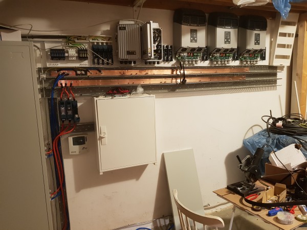 Mě ale budou měniče na dvou fázích často pospávat. Pojedou jen pro stroje, sporák a vytěžování. Do budoucna i TČ.marko250 píše:Tohle dělá >marsal64 rovnou na 3f,ať máš představu kolik místa to zabere a má šikovně dané šíny.V pravo 3x XTM400-48 a v levo od nich dva regulátory na panely.