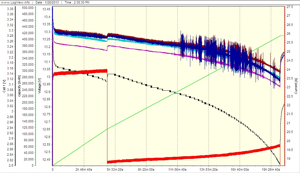 I had three 120VAC lights attached to the inverter for the first 5 hours, but turned off one 60W one after that since my 400W inverter was heating up and I was trying to shoot for 400AHA in 20H.