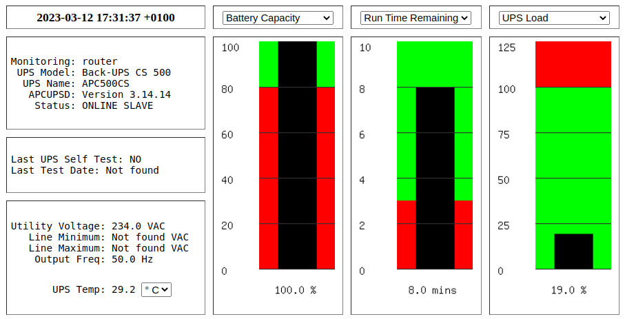 Mám zapojené ešte ďalsie 2 rovnaké UPS. Jedna je na NAS, kde ale nevidím presné hodnoty zaťaženia. A čas ochrany je tam uvedený dosť optimistický... a ďalšia je na obehové čerpadlo, zmäkčovač vody, čerpadlo osmózy.