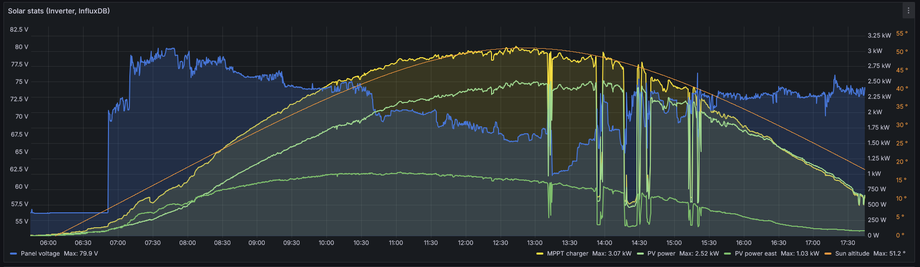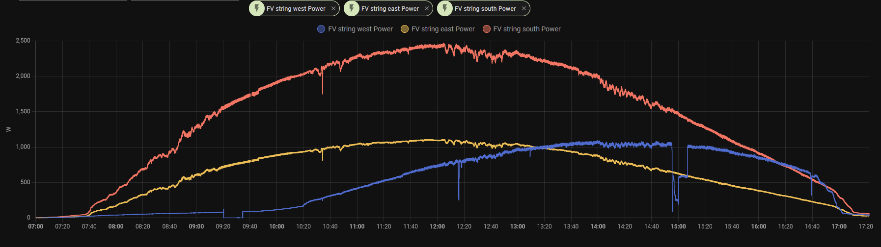 zisťujem, že ďalšie kW by sa zišli. Chcel by som minimálne pridať ďalší string na západ, asi tiež 2S2P, ale už celkom pochybujem o optimálnom MPP bode pri takej kamikaze konfigurácii. A MUST PV1800 je už teraz trochu prepanelovaný, tak rozmýšľam o druhom, samostatnom MPPT na nový string. Pri tej príležitosti by som asi skúsil napojiť napr. východný string na nový MPPT a porovnať priebeh výkonov počas dňa. Prikladám screenshot z dneška, tmavšia zelená je východ, svetlejšia je juh (2x toľko panelov ako východ) a žltá je ich súčet. Nemá niekto overené aký rozdiel vie spôsobiť takéto zapojenie stringov (90°) na jednom MPPT vs 2x MPPT? Dík za postrehy.