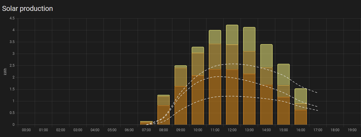 Na grafe z HA je východ, juh a západ, pekne vidieť ako ktorý nastupuje a kedy klesá. Východ a západ sú rovnaké - 2S3P z 460Wp panelov, juh je 2S3P z 555Wp panelov.