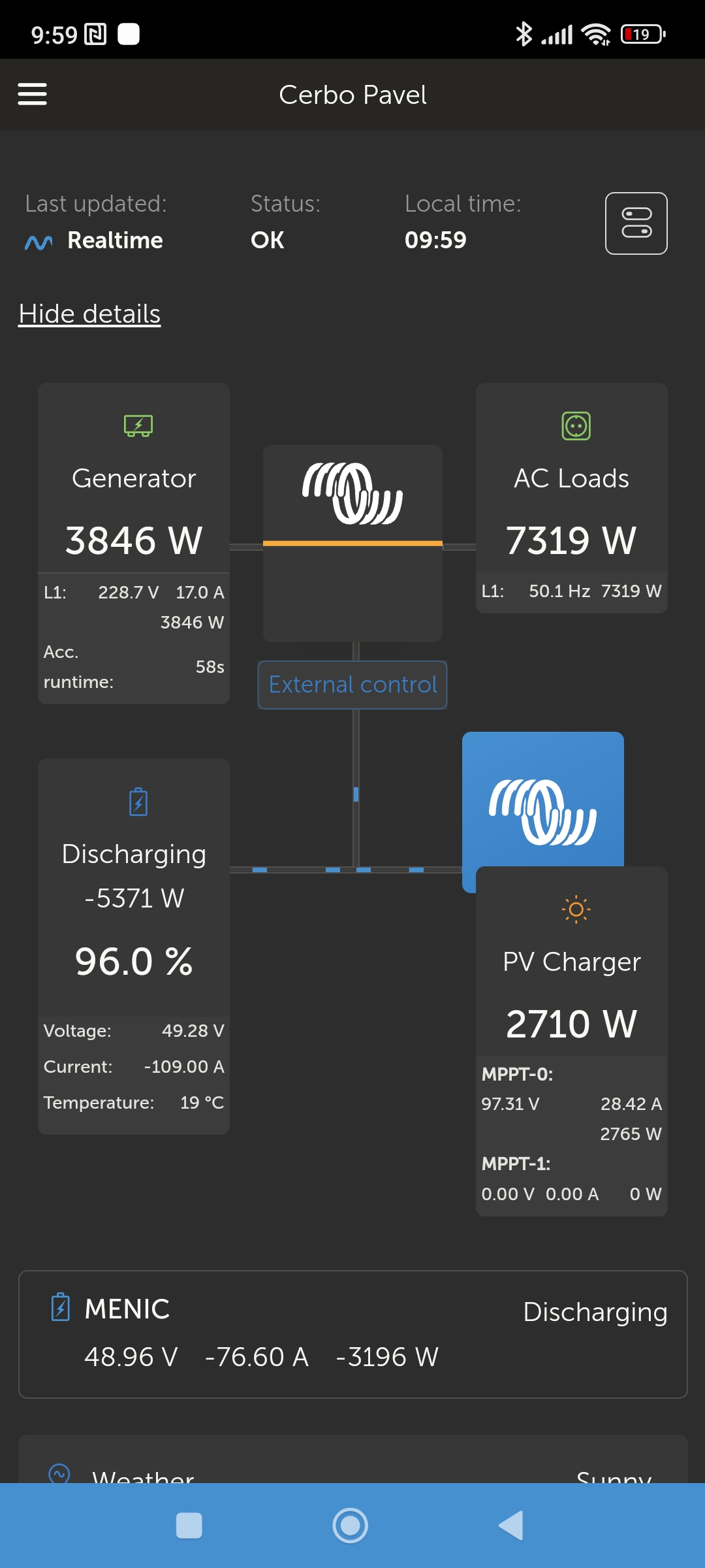 Bms v baterkách pylontech mi při vyšším soc sníží nabíjecí proud mppt přes hodnotu CCL což je normální a dělalo to vždy a tak to má být. Ale dříve když jsem zapl spotřebiče tak mppt začali dodávat víc aby pokryly spotřebu ale teď najednou stále omezují výrobu podle CCL i pro přímou spotřebu a raději systém vybíjí baterky. Až soc klesne pod 90% a CCL vyroste zpět na 149 tak teprve z panelu začne téct plný výkon. Měl jsem podezření že nějak victron změnil logiku protože jsem provedl upgrade cerba ale i když jsem vrátil původní verzi tak se to chová stejně.