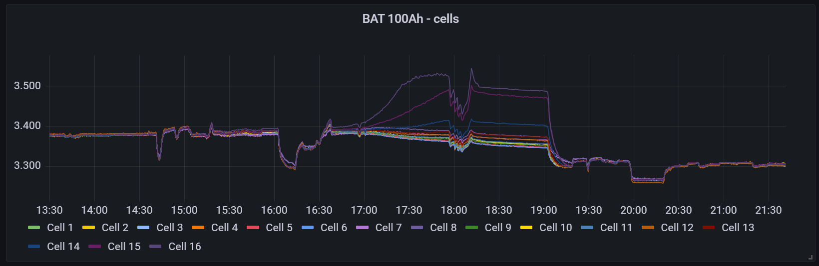 Pro úplnost musím ještě dodat, že k těmto dvěma paralelním Lion jsou ještě 4P PB se štítkovou hodnotou 320Ah reálně tak 1/4 (pravděpodobně ještě míň)