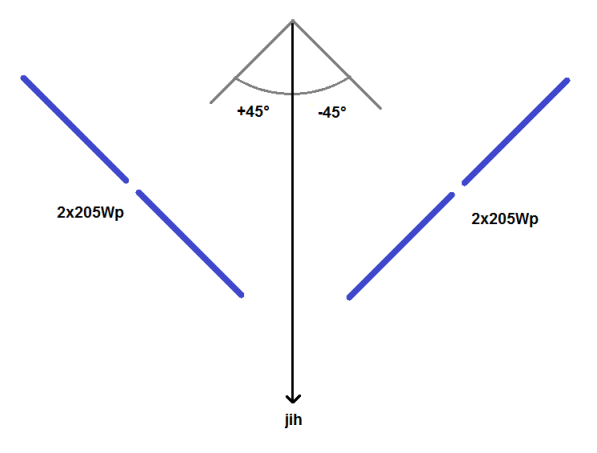 Pan Taum - díky, to je přesně ono. Mám to stejně, jen lehce potočeno, náklon střechy 45* . To ale znamená, že i při šikmém osvitu obou stringů to dá cca 800W, což je na Epsolar 4215 už při 12V moc...