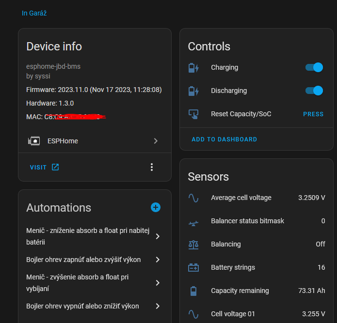 Áno, tak to fungujeKony.cz píše: stř lis 29, 2023 9:52 amChápu to správně, že pomocí ESP32 se připojím přes BT k BMS a přes ESP32 wifi to pošlu do HA ?