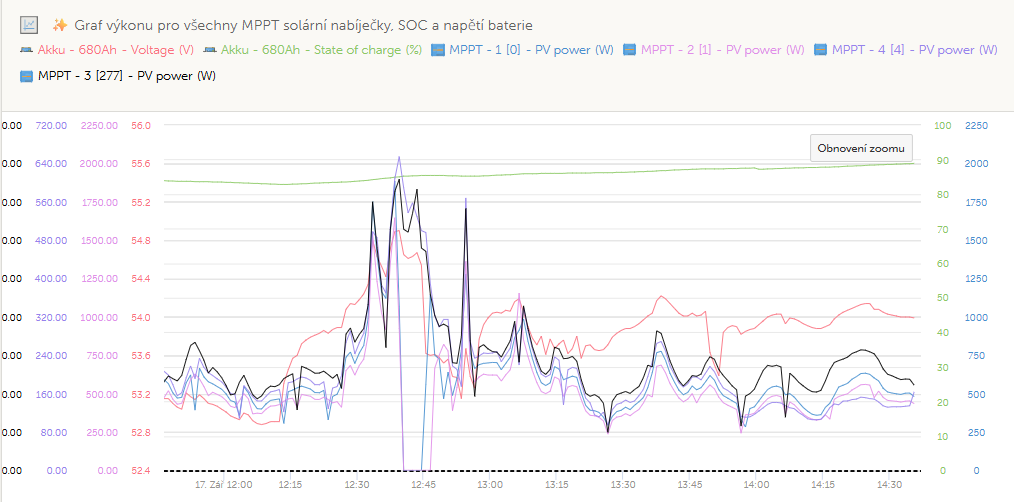 Prosím o radu, napadá někoho může způsobit tak prudký nárůst napětí na baterce, které tam stoupalo velmi prudce už někde od 12,15 , že mě to přepnulo MPPT na flot a absorci ? To napětí pak kleslo...