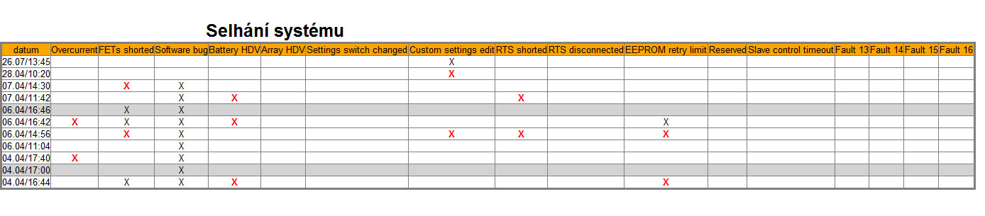 Panely jsou samozrejme jisteny tak jak maji byt, tj. kazdy pol kazdeho stringu 10A pojistkou v PV odpojovaci, vcetne prepetovek atd. je to udelano dobre. S tim Tristarem byly problemy jiz prvni den provozu, z nejakeho duvodu drzel napeti panelu na napeti baterek (choval se jako PWM regulator) tusim na druhy den jiz fungoval normalne ..