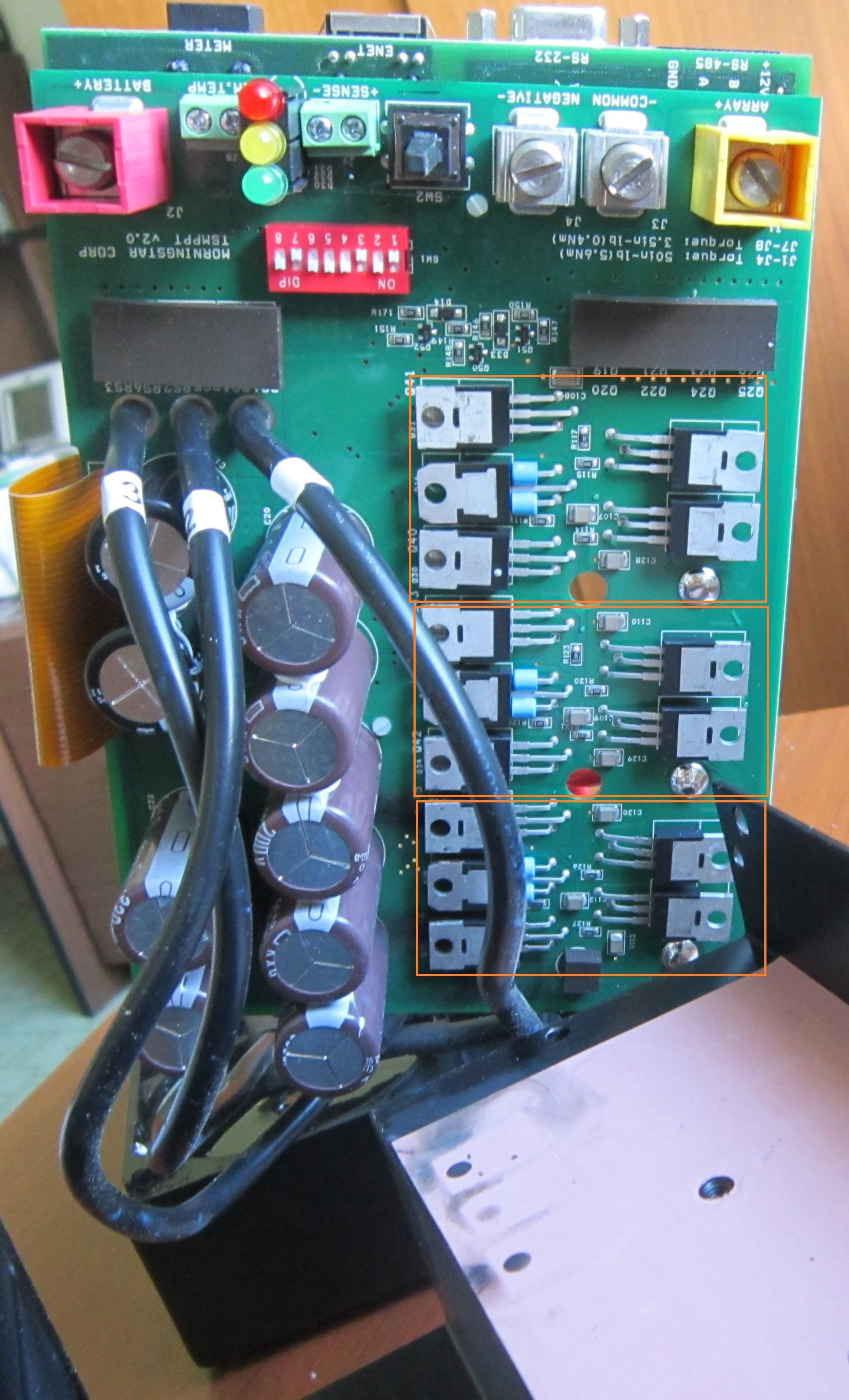 Napiš si do Morningstaru http://morningstarcorp.force.com/?cu=1& ... Us&l=en_US ,popiš problém a velmi pravděpodobně ti pošlou druhý kus. Vypadá to na bouchnutý kondenzátor nebo proražené tranzistory Q40 Q41 v krajní skupině. Tristar obsahuje jakoby 3 kusy 20A MPPT regulátorů, které se zapínají podle potřeby.