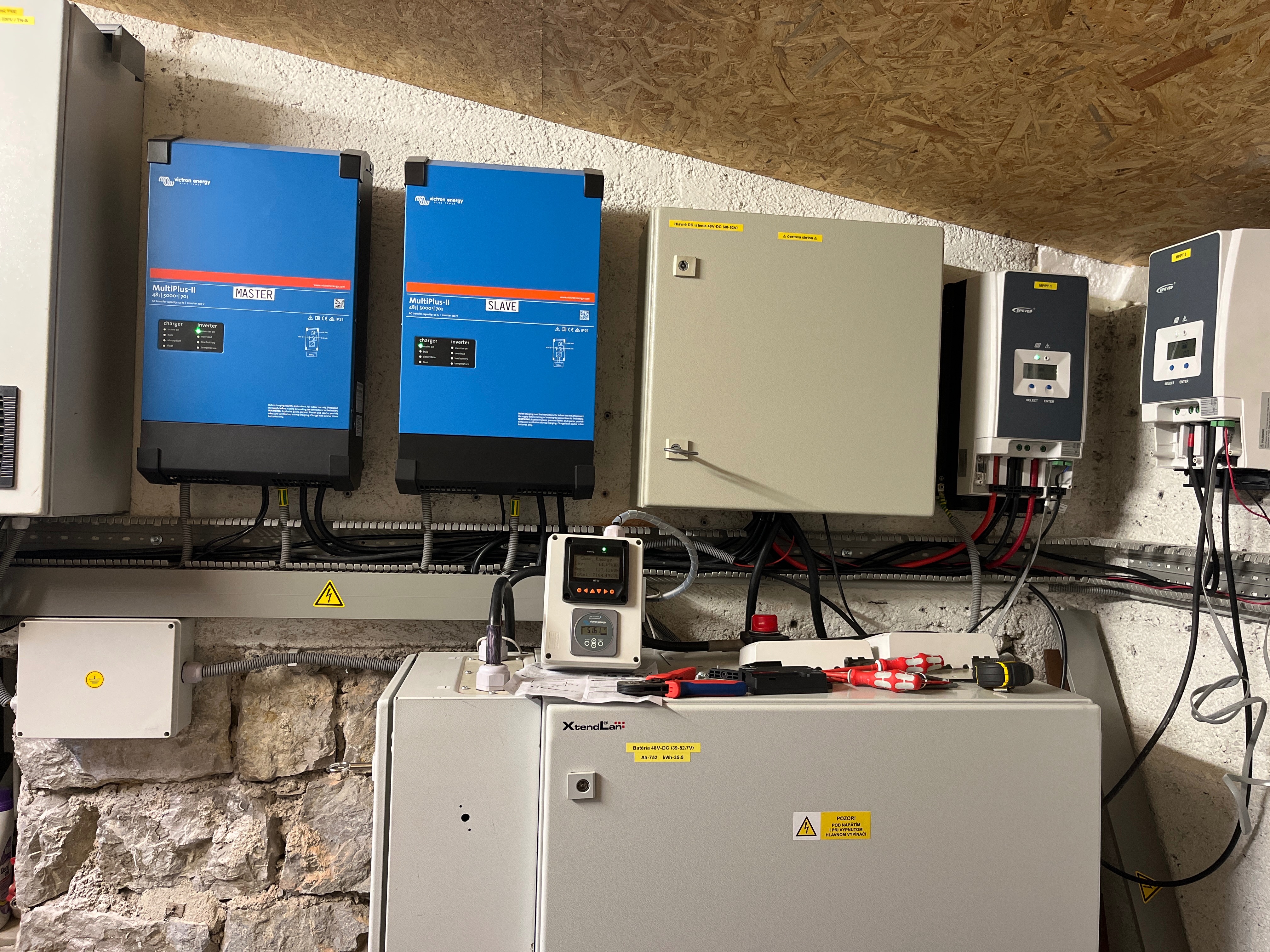 SkyFVE 8 kWp na výzkumné "chytré" chatě. 4x MPPT Epever XTRA4415N 4x40A, 3x LG Chem Li-Ion 12s 156Ah (cca 20 kWh/44V), SkyPowerBox LF 4810 1kVA, Victron MP 48/3000, REVO VM II 5.5kW + PLC Siemens Logo! + Dell Optiplex 3040 Micro (Proxmox: HA, Node-RED, InfluxDB, Grafana, Mqtt, Zigbee2Mqtt, Samba, Tailscale)