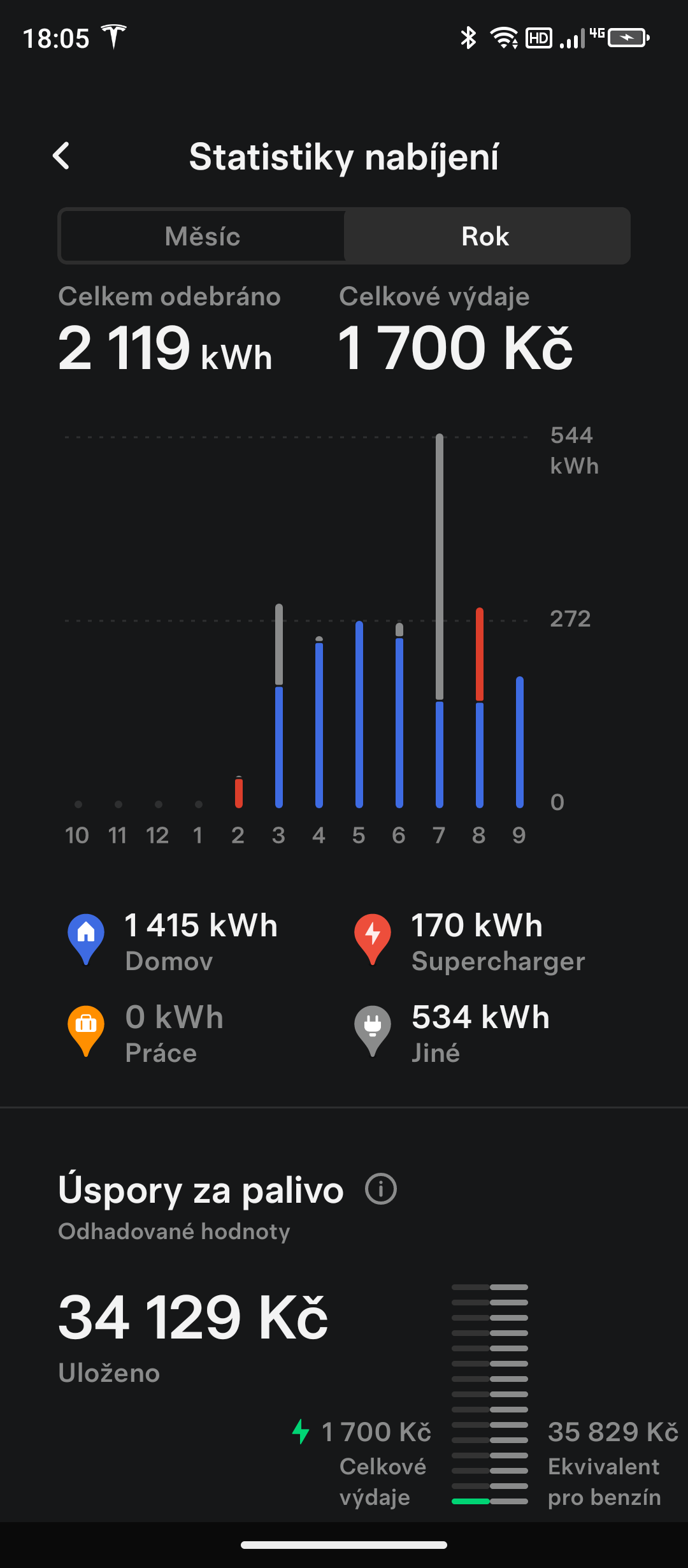 Tak EV si doma zatím vzalo z FVE 1.415MWh od února,v zahraničí pak na placených tesláckých superchargrech 170kWh a zbytek 534kWh na free nabíječkách při cestování po světě.Ještě je tam 15eur jednorázově platba na recepci hotelu v Bosně.Auto zatím hodnotím jako velmi schopné ,uživatelsky přívětivé a stále 100% spolehlivé.Nyní budu poprvé měnit lišty stěračů(26 522km),celoroční pneu se znatelně neojelo od února, co jsem je nasadil místo originálních letních, nejsou posekané kraje ,nikde nic nevrže, netluče na podvozku.Upgradama se vše ještě více zlepšuje,nebo se otevírají nové funkce a to zdarma.Co se týká degradace baterky ,tak jsem ji naposled měřil při 25 636km ,cykly- dobíjecích 87.1/vybíjecích 81.5, degradace 2.918%