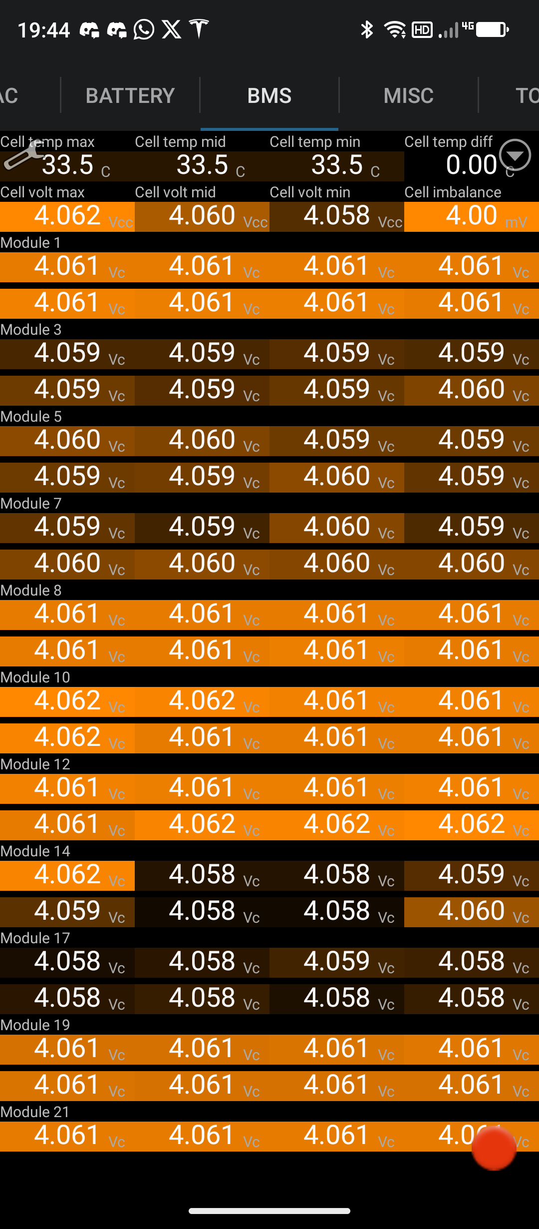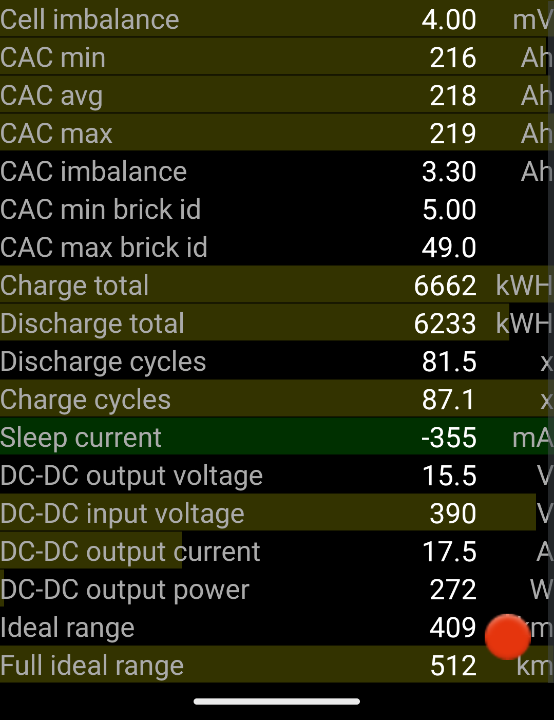 Říjen: 56MWh za měničem, na tento měsíc tedy připadá 880kWh a z DS jsem vzal 55kWh. Jinak baterka v autě se chová pěkně při 100% nabití, u konce nabíjení se články moc nerozjíždí 4.180V-4.166V(14.0mV) a pokles je po 29tkm malý 78.8kWh nová a nyní 75.4kWh.