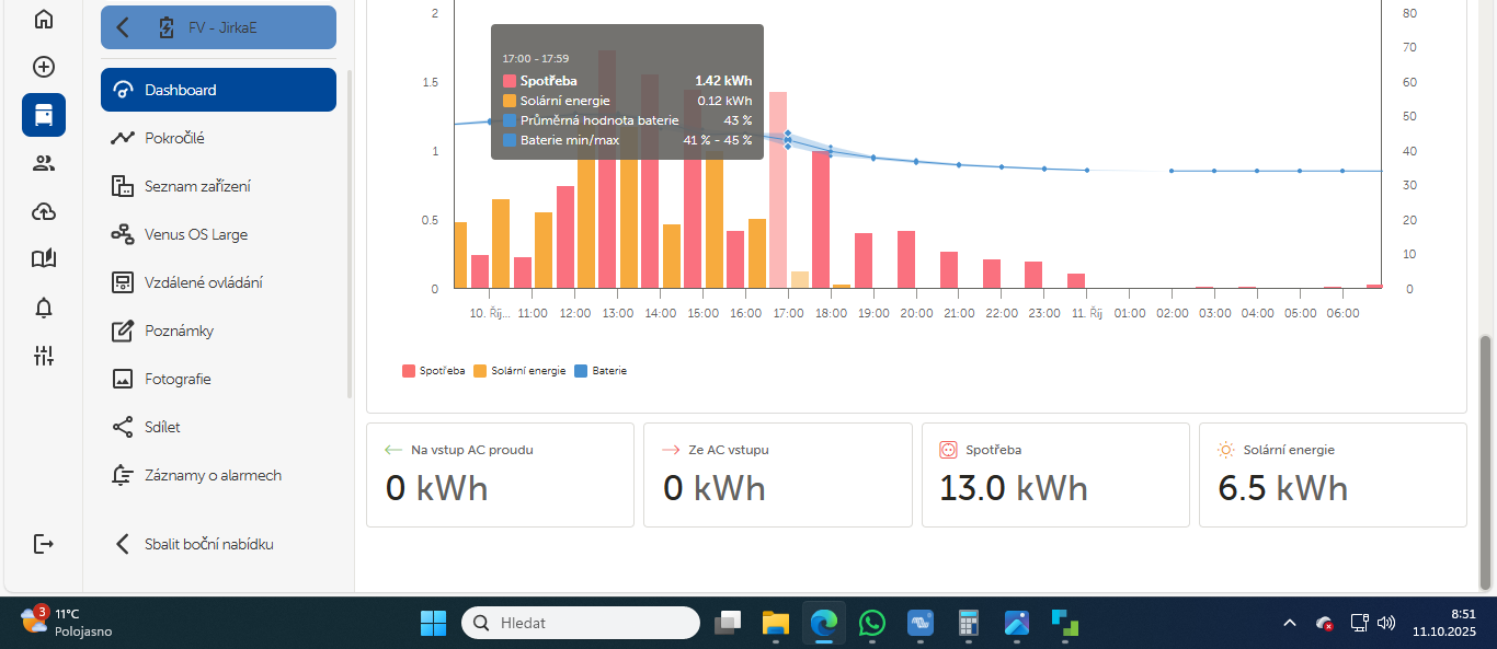 Dnes v noci ALE NEPLÁNOVANÝ Blackout - nečekal jsem to, kdy SOC bylo večer přes 40% a v ten moment na 34% ale napětí sjelo na 48V a vše se v noci vypnulo a byla tma a ticho - jak krásné - ale už ne moc praktické - když se vypnou i nouzová osvětlení a lednička a mrazák