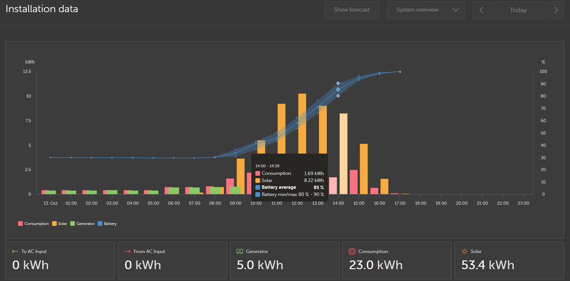 9,2kWp JV 45°, 4,6kWp JZ 45°, 2,3kWp JV 90°, 2 x Victron MP II 5kVA, 3 x SmartSolar 150/70, Smartshunt, Cerbo, 16x280Ah + 16X300Ah + 16x300Ah LiFePO4 + 3xJK BMS.