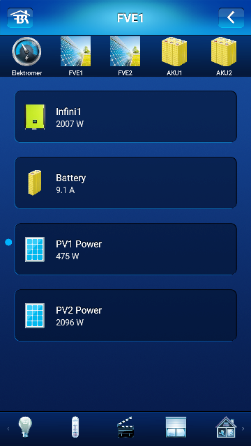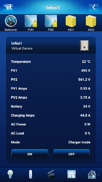 Úkazka výpisu dat přes JSON: 5) Ve Fibaro HC2 mám definováno několik virtuálních zařízení, které si každé 3 vteřiny vytahují z PLC obsah proměnných pomocí JSON. U každého Infini tak mám vždy aktuální proudů, napětí, výkonů, zátěže, teploty a také režim, ve kterém Infini zrovna pracuje. Jakmile mám tyto hodnoty v HC2, můžu na ně navěsit libovolnou logiku - například, pokud příliš stoupne teplota měniče, tak můžu automaticky vypnout bojler/pračku/myčku a otevřít garážová vrata, aby se vyvětral suterén...možnosti jsou vlastně nekonečné.