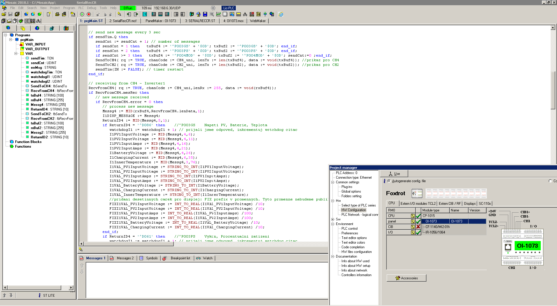 Ukázka IDE s kouskem kódu pro PLC: 3) Obsah několika vybraných proměnných nechávám vypisovat na displej. Každému invertoru jsem na displeji PLC dedikoval tři virtuální obrazovky, mezi kterými lze přepínat pomocí HW tlačítek UP/DOWN.