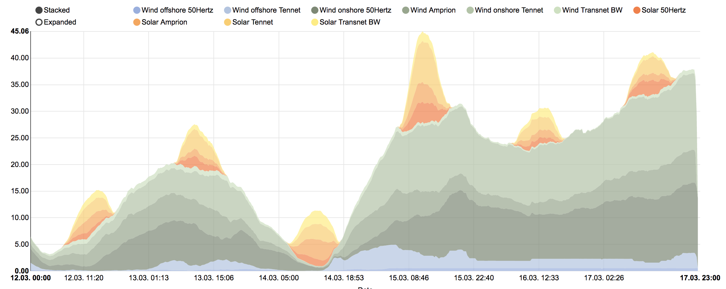 V DE fouka dost, uz skoro 40GW:kybos píše:Fouká asi hodně, protože ČEZ právě spustil neplánovaně mimo běžnou dobu nízký tarif. Větrníky nejspíš běží naplno a cena na burze bude nízká, tak koukají kam ty megawatty vypustit.