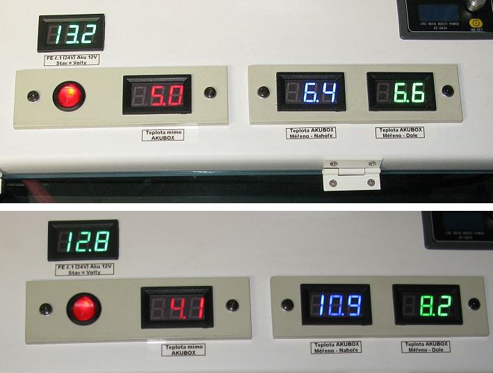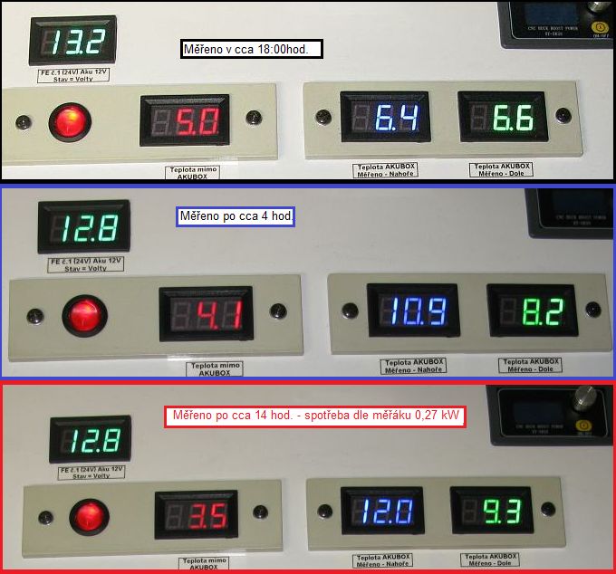Tak po cca 4,5 hod. (spotřeba 0,09kW) mi to ukazuje 10,9°C = nahoře a 8,2°C dole v AkuBoxu.