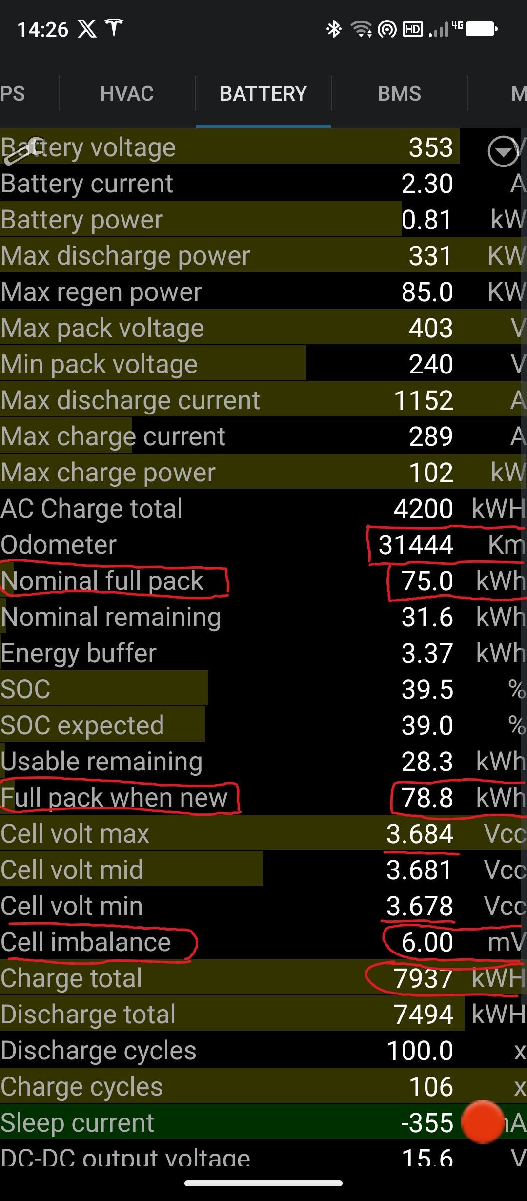 .Každopádně když nabiju auto na 80% a navigace mi v cíli ukazuje dojezd s 20% ,tak to v 99.9% vždy tak je a to je to podstatné , navíc to pak koresponduje s průměrnou spotřebou na palubáku.Perfektní jsou také imbalance mezi články,pouhých 0.006V. Co se ale týká přesného měření jízdy,tak to lze udělat jen tak,že na kabelu nabíjení prostě musí být elektroměr třetí strany a ten ukáže při nabití na stejné množství SOC (80%), kolik to skutečně na dané jízdě vzalo.Třeba včera jsem vypotřeboval 11% baterie od nabití na 80% , nabíječka po nabití zpět na 80% ukazovala 8.512kWh a auto aplikace hlásila 8kWh doplněné energie.Palubák hlásil 16.4kWh/100km při té svižné jízdě na 50km,takže to celkem odpovídá,jen se do toho nezviditelňuje rekuperace,to by vypadalo hůř