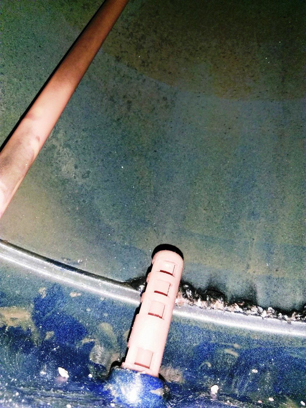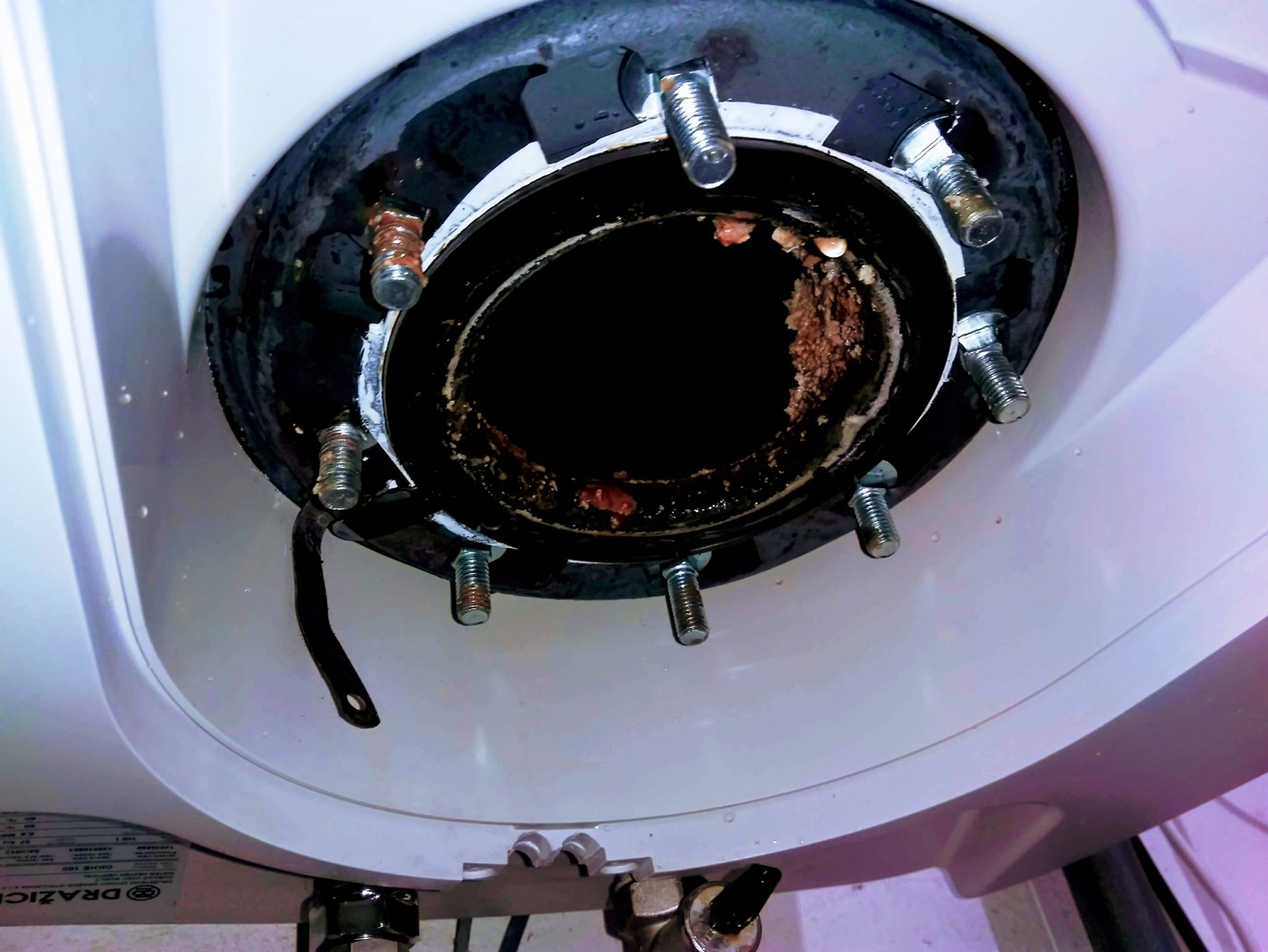 Hromádka usazenin zůstala také na víku příruby. Původní magneziová anoda byla již zcela sežraná a zůstal jen šroub s pahýlem, viz foto: Poté, co jsem zevnitř bojleru vytahal většinu nepořádku, jsem musel konstatovat, že Dražice to asi mají opravdu vymyšlené dobře, neboť kromě několika míst na svárech se nikde vodní kámen nedrží:
