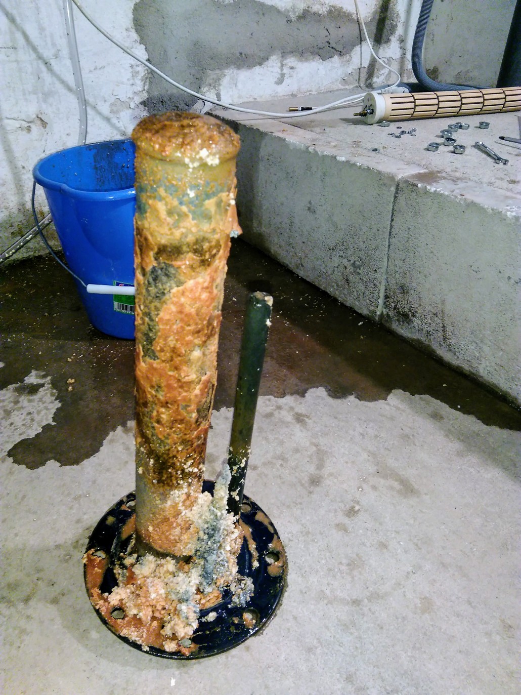 - knoflík termostatu Veškerou horkou vodu z bojleru jsem napustil do vany, abych ho nejprve trochu ochladil tím, že se naplní novou, studenou vodou. Poté jsem bojler odpojil od trubek a úplně vypustil. Po odmontování příruby se vysypalo asi 5 kilo vodního kamene, rzi a obecného bordela. Nedovedu si představit, že někdo tuto operaci provádí v koupelně