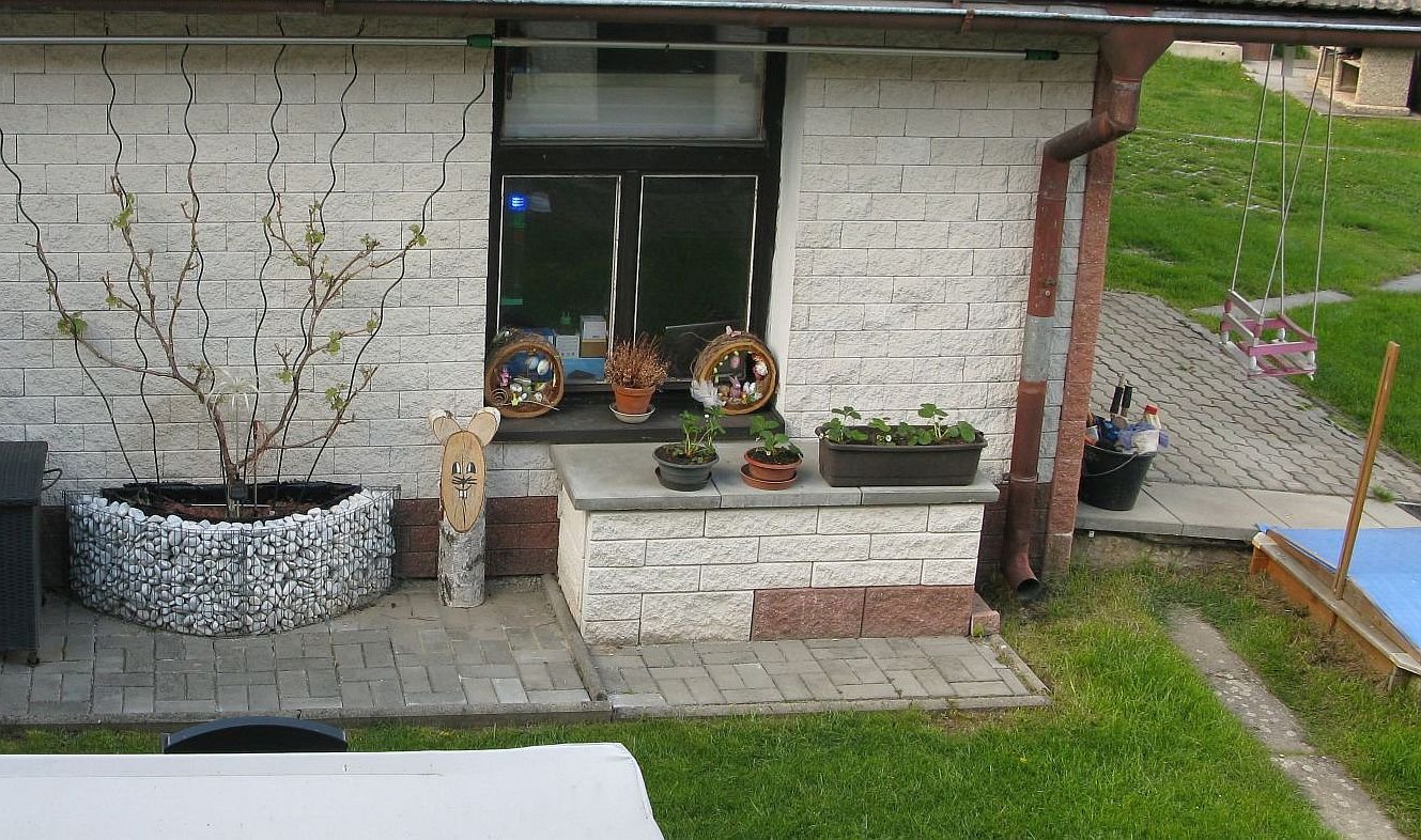 Pohled z okna kuchyně do garáže