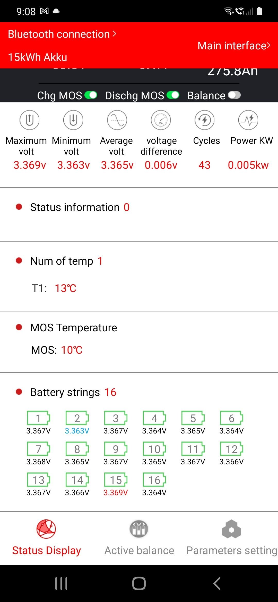 Takhle vypadala BMS ve středu ráno - SOC z BMS je vždy o něco níž než SOC ze Shuntu a na BMS mám parametry nastavené o kousek výš = zkušenost od minule