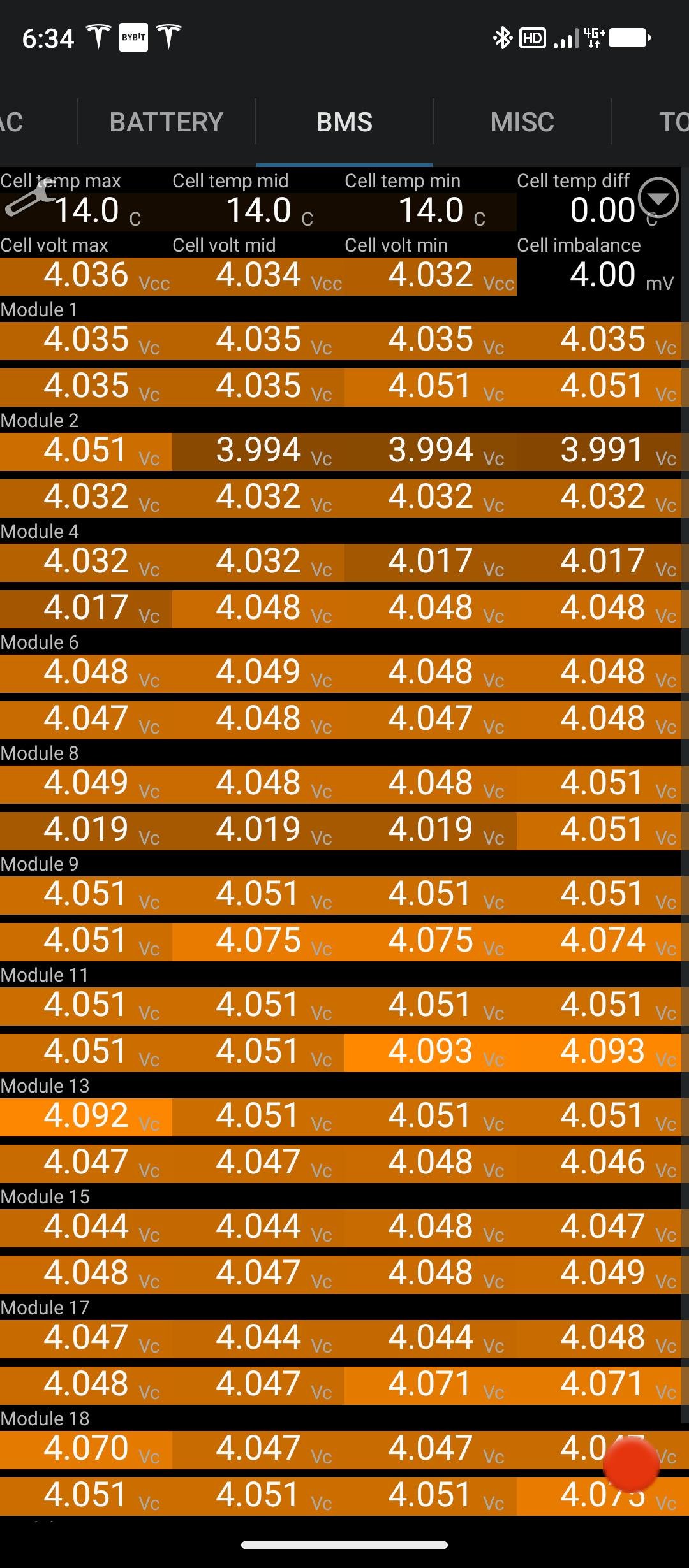 Jinak tam u těch napětí článků to ukazuje tu imbalance nějak divně ne? Min napětí 3,994 a max skoro 4,1, to je rozdíl cca 100mV u takto vysokého SOC - to neni úplně dobrý, necháváš to občas sedět při SOC >90%? Ať se do dobalancuje..