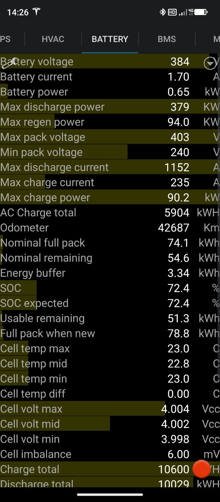 To bylo foceno při jízdě a bylo tam 75% nabito zrovna a ta apka nestíhá načítat proměny mezi těmi packy u akcelerace a rekuperace ,podstatný je úhrn .Jezdím do 20tkm ročně no a asi 4x jsem nabil za ten rok na 100% a hned pak jel ,ať se to má jak zbalancovat a spočítat úbytek.