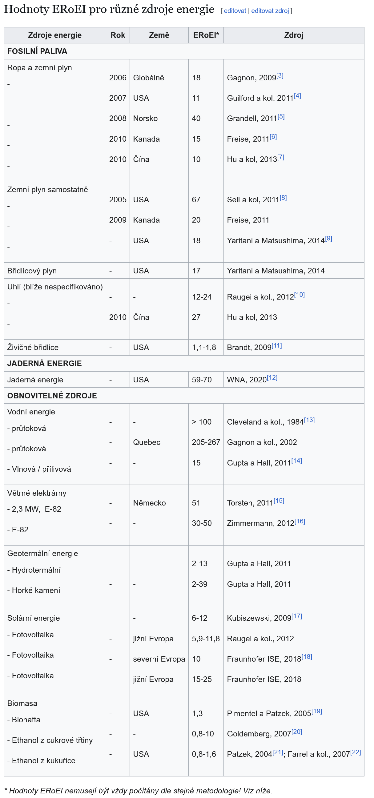 https://cs.wikipedia.org/wiki/ERoEI#:~: ... 20energie. Je to důležité proto, že moderní společnost potřebuje EROEI co nejvyšší. Za limitní se pokládá hodnota 7. Jinak zkolabuje a třeba bude fungovat dál ale jako zaostalá společnost.