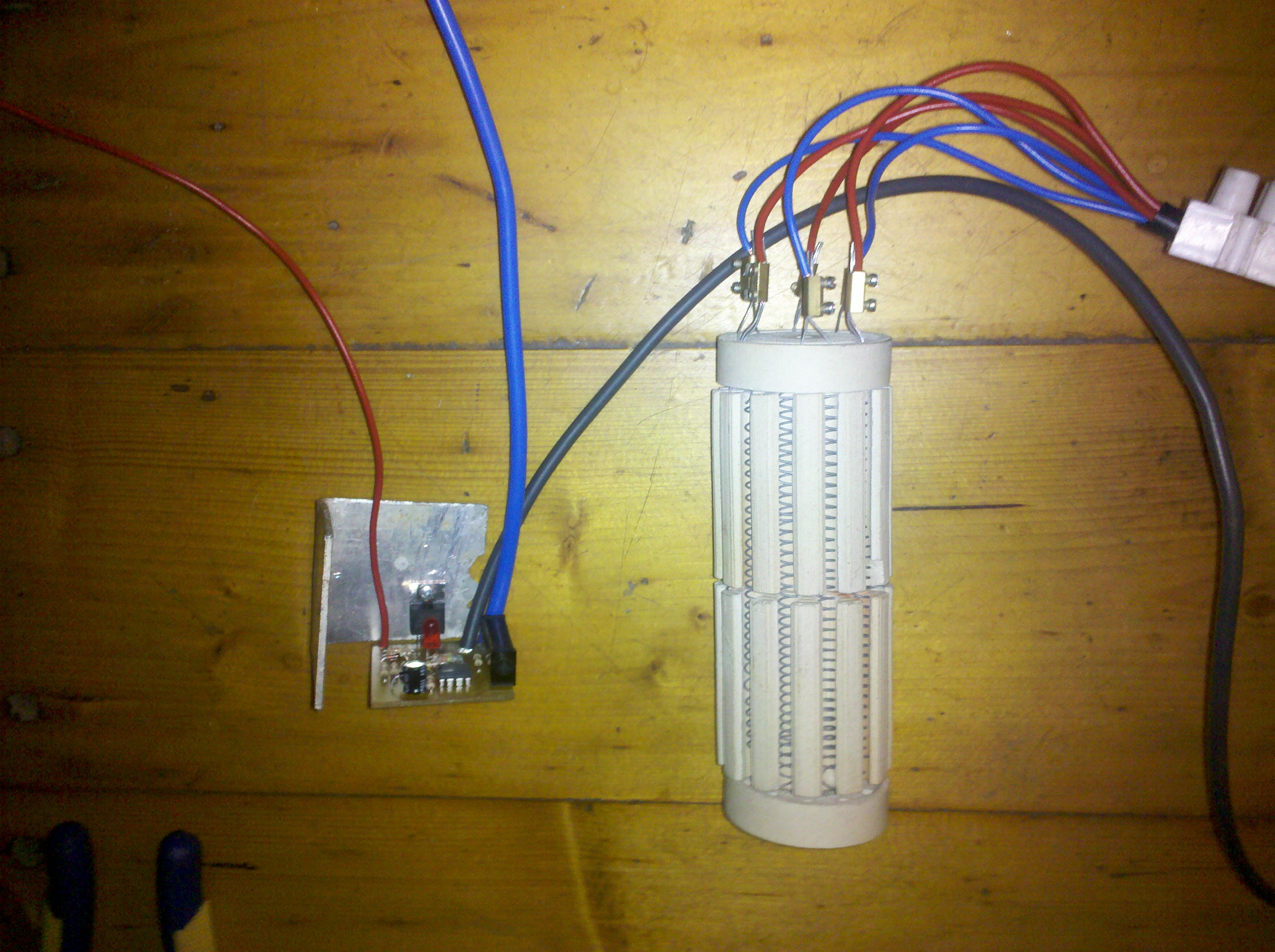 Nejvíc pracné bylo vyrobit zátěž. Použil jsem staré 6 článkové topné těleso z boileru. Z něho jsem použil 2 články. Uvnitř jsou 3 spirály s odporem 3,6 ohm zapojené paraelně. Takže výsledný odpor je cca 1.2 ohm. U použitého tělesa je potřeba pracovat opatrně. Vyhřátá pružina ráda praská, ale materiálu je dost, tak není třeba se bát.