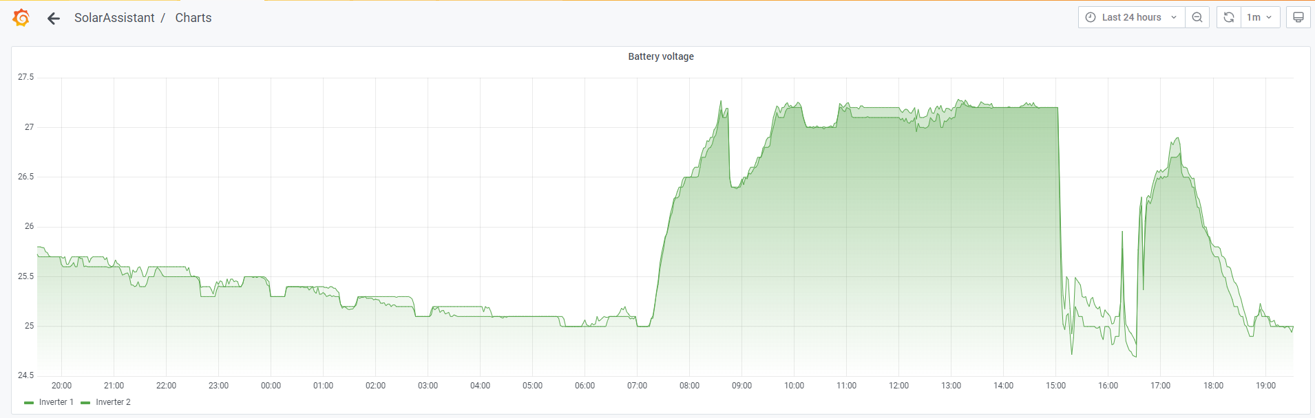 Cipis mi nejde o to že pomalu pokrývá zátěž mi jde o to že při zátěži 250až300W a nabitých baterkách ty panely nezatíží a bere proud z aku.Když zvednu odběr třeba tou plotýnkou tak zatíží panely sníží jim napětí ze 75V na třeba 63V a tu spotřebu v pohodě vykryje.Jo a baterky má připojené svářecím kabelem.Napětí na baterkach mi nevím jak vám ale mi chodí od těch 26V až do 27,6V ale když nabíjí a je tam třeba 27,4V a začne vybíjet tak skočí na 26.5V a drží podle zátěže to měřím přímo na baterkách.To je taky skok skoro o 1V a přikládám to tomu že částečně měřím napětí nabíječky aby ten proud tam dostala tak to napětí zvednout musí.Na 12V mám 60ah a tam se řídím podle napětí a vybíjím na 11,5V .Jinak na zátěž reaguje rychleji jak GC1000.Včera jsem rozpojil 4 aku a dal je nabíjet a teď jdu první pár připojit.