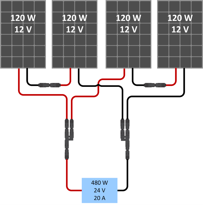 Na paralelní spojení dvojic panelů se používají MC4 rozbočky, mám to tam nahoře napsané, dodal jsem tam i odkaz.