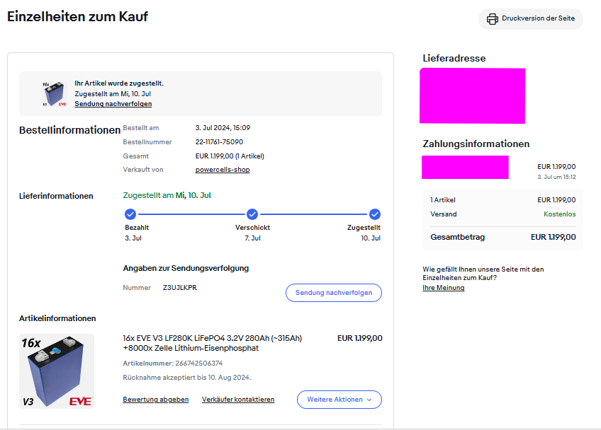 Prodejce na vlastním webu uvádí u těch EVE článků 280Ah prodej s 0% DPH. Jenže podmínkou je, že doručovací adresa musí být v Německu. Ono se totiž ta možnost nakoupení takto bez DPH dle zmíněného ustanovení vztahuje jen interně na Německo.