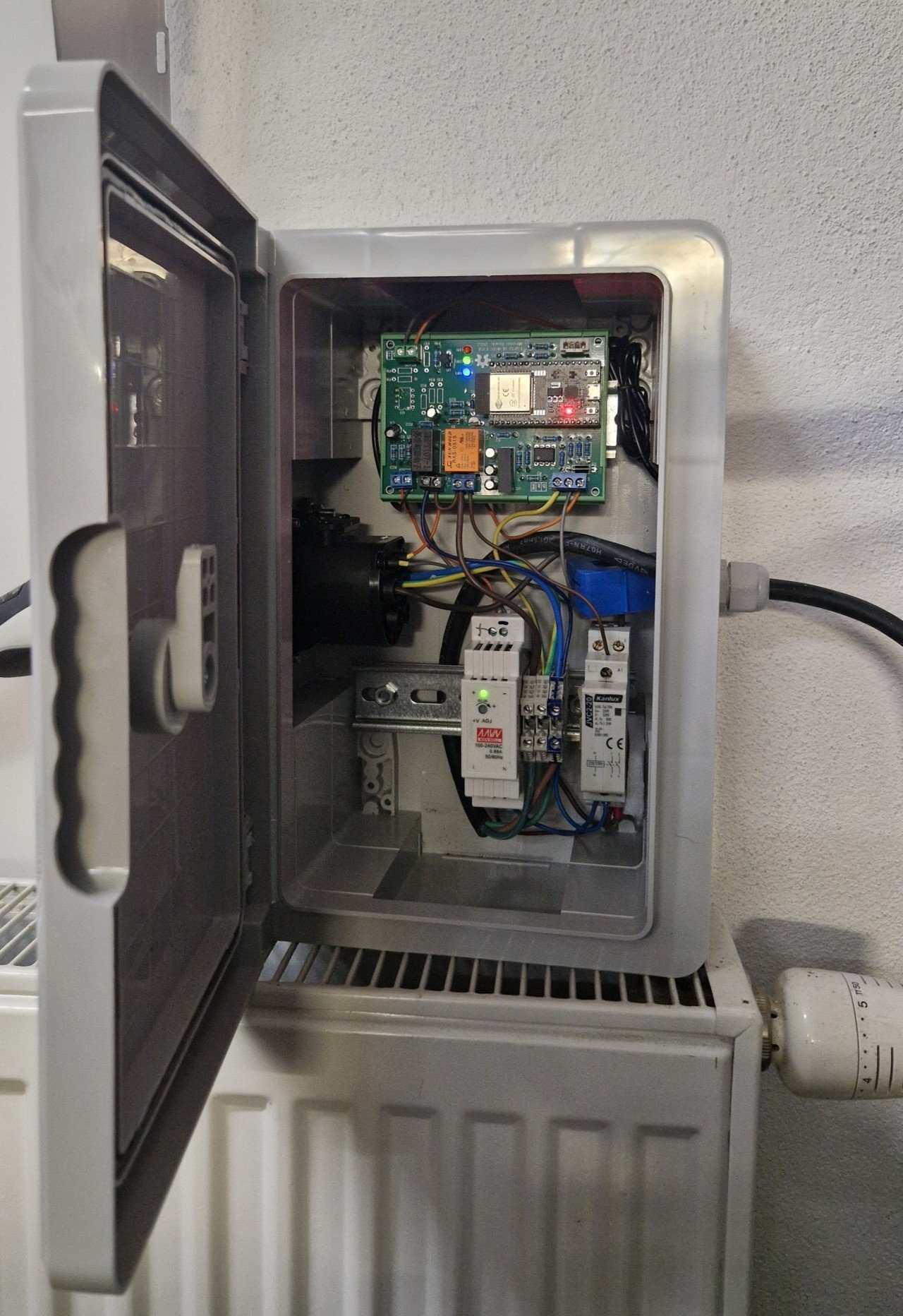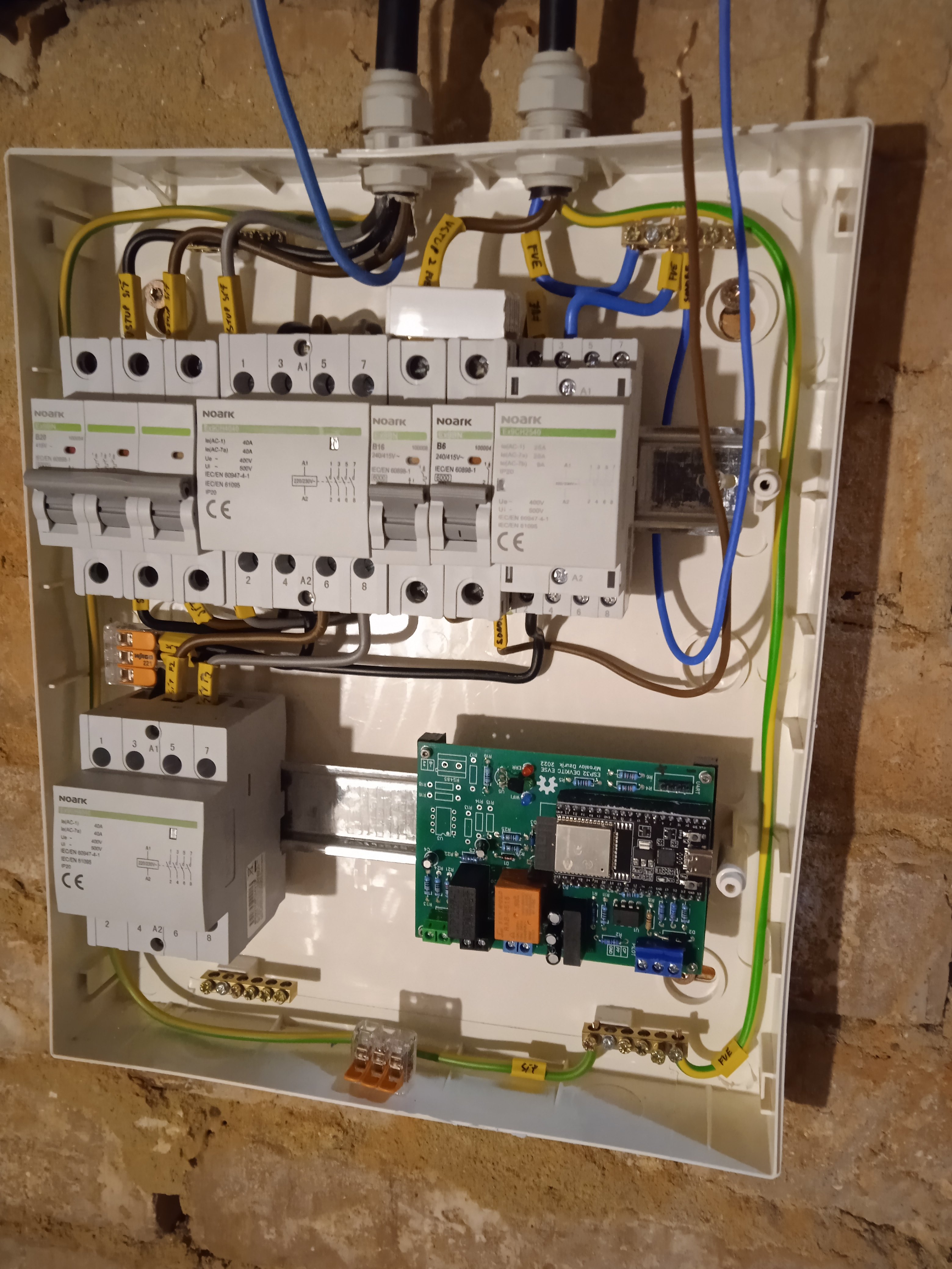 tak vetsina veci je doma, jen jsem si nevsiml, ze mam doma jen 3x20A a 1x16A jistice, tak v tejdnu vymenim za 25tky, hlavne na privod ze site + jeste chranic ... Ta 40tka stykac je pro sit / 25tka stykac pro FVE (z tama pocitam max 20A na dobijeni). Tyhle dva hlavni stykace se budou spinat pres sonoff dual r3 (NT proud/FVE vykon), snad to dojde dneska. Dole je ridici deska od TomHC.