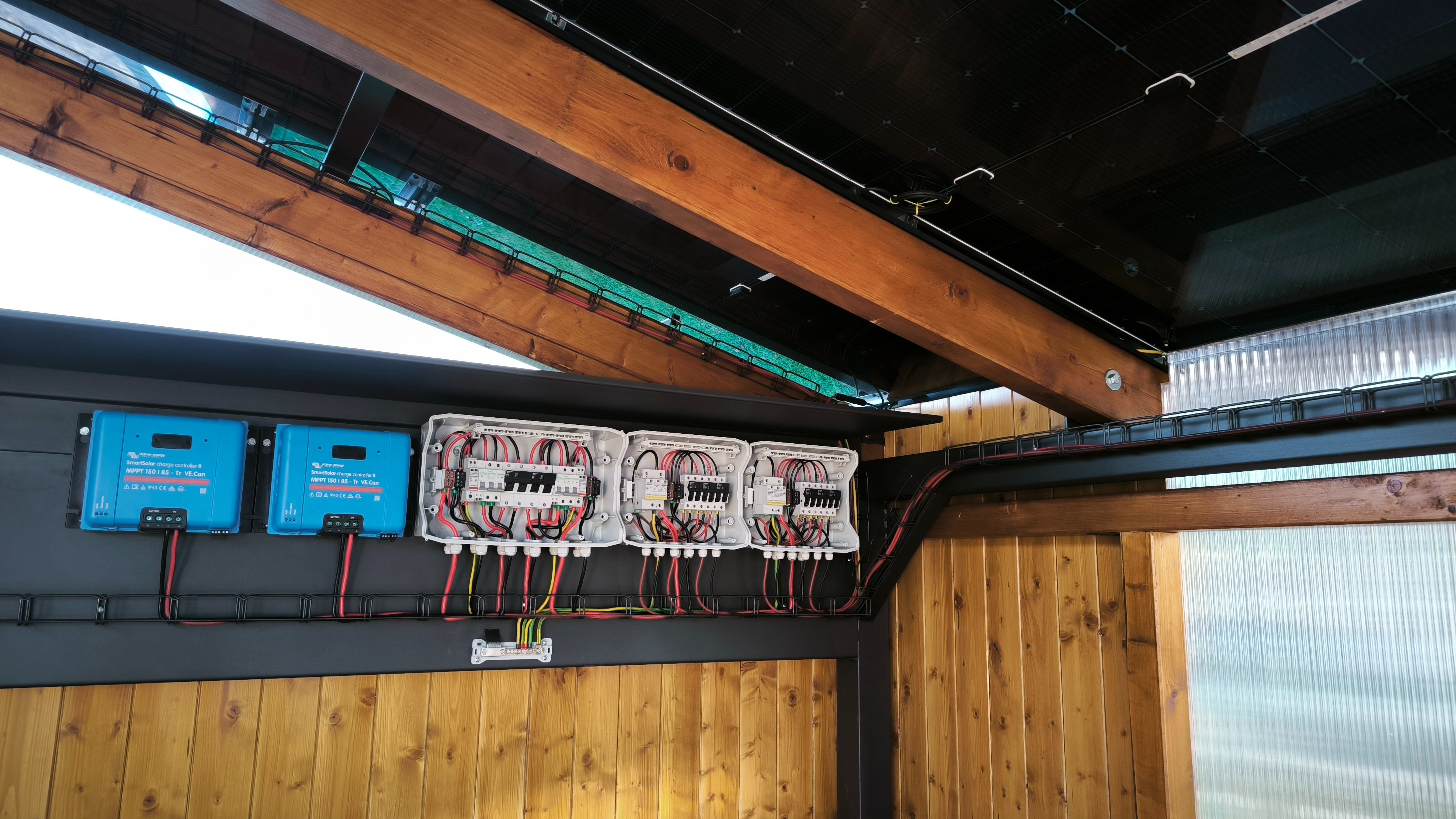 2. JZ 8 kWp sklon 15st.solárni přístřešek stř. krytina 18x JA Solar Bifacial , 2x Multiplus 5000, 2x MPPT Victron 150/85, vyhřívaný bat.box 16x Lifepo4 LF304Ah JKBMS 200A V15, Cerbo GX, SmartShunt 300A