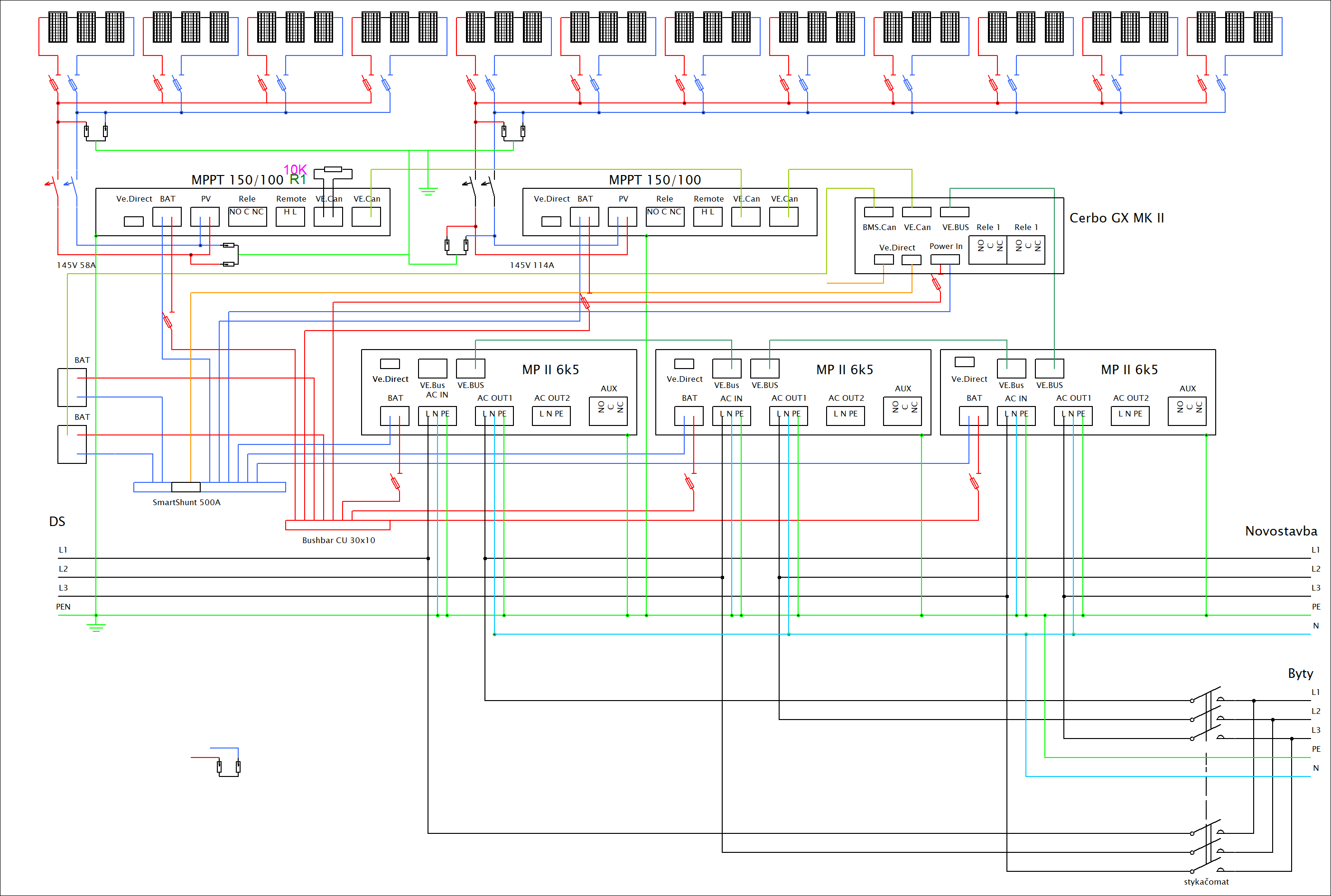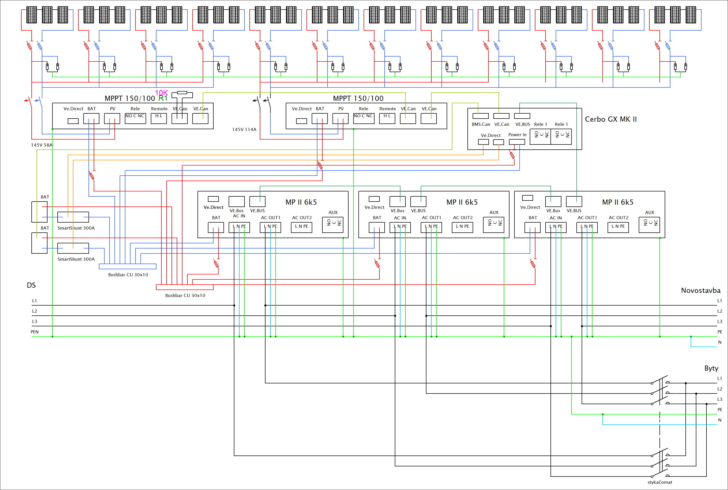 Střecha jih 18x445Wp, 18x455Wp, 9x450Wp, 3x3s5p, celkem 20250Wp. Kotec 15x385Wp, 3s5p,celkem 5775Wp. 3xVictron mppt 150/100 , 1x150/85, Victron Phoenix5kVA, MP2 5kVA, MP2 10kVA, v sérii, 48V,