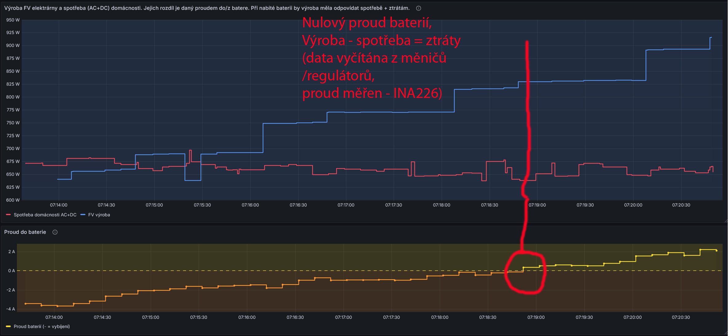 Zrovna je jen zanedbatelná strand by spotřeba a údaje výkonu z MPPT a součet nabíjecího výkonu a výkonu do AC zátěže celkem sedí...
