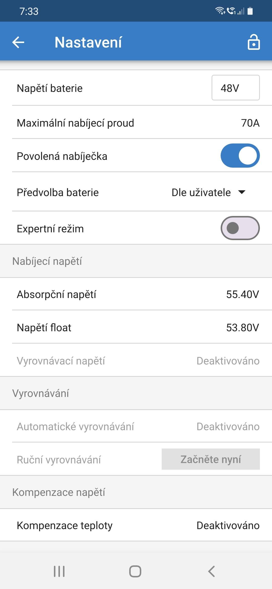 Mate mě v tom, že v expertním nastavení je továrně asorbtion 56,80V (toho to snad tím pádem ani nedosáhne) a float 54,00V