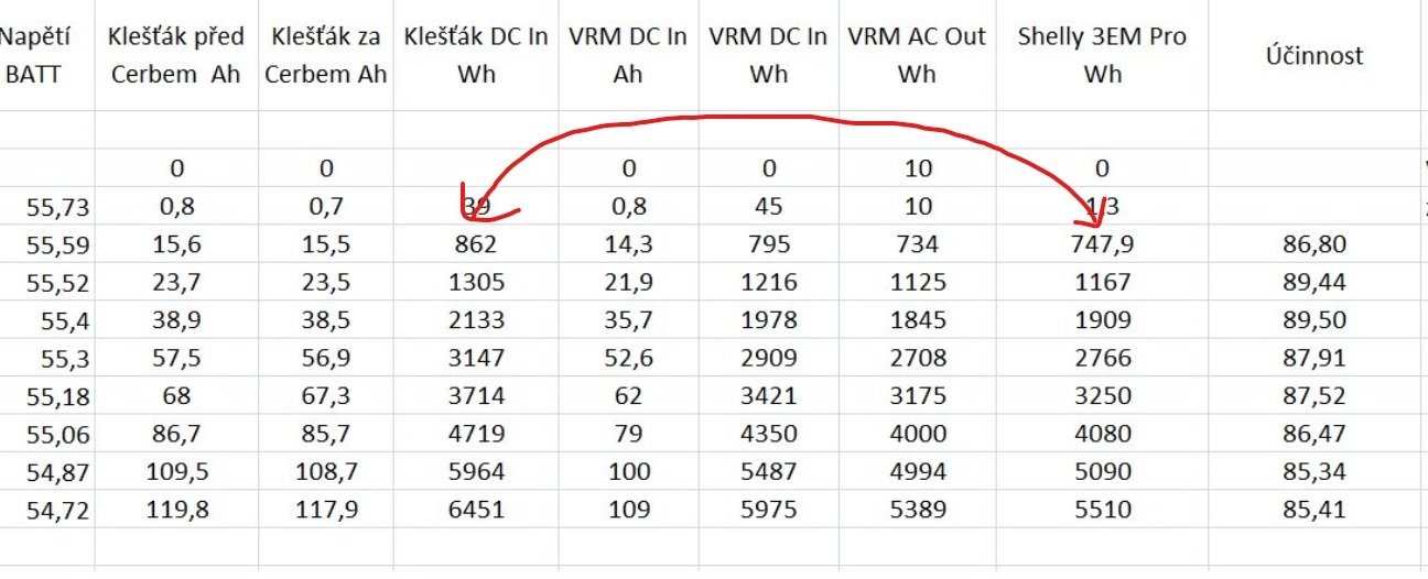 V tabulce jsem počítal: napětí x klešťák za Cerbem(u měniče) = spotřeba z baterky (pro Multiplus). Měřáku Shelly věřím.